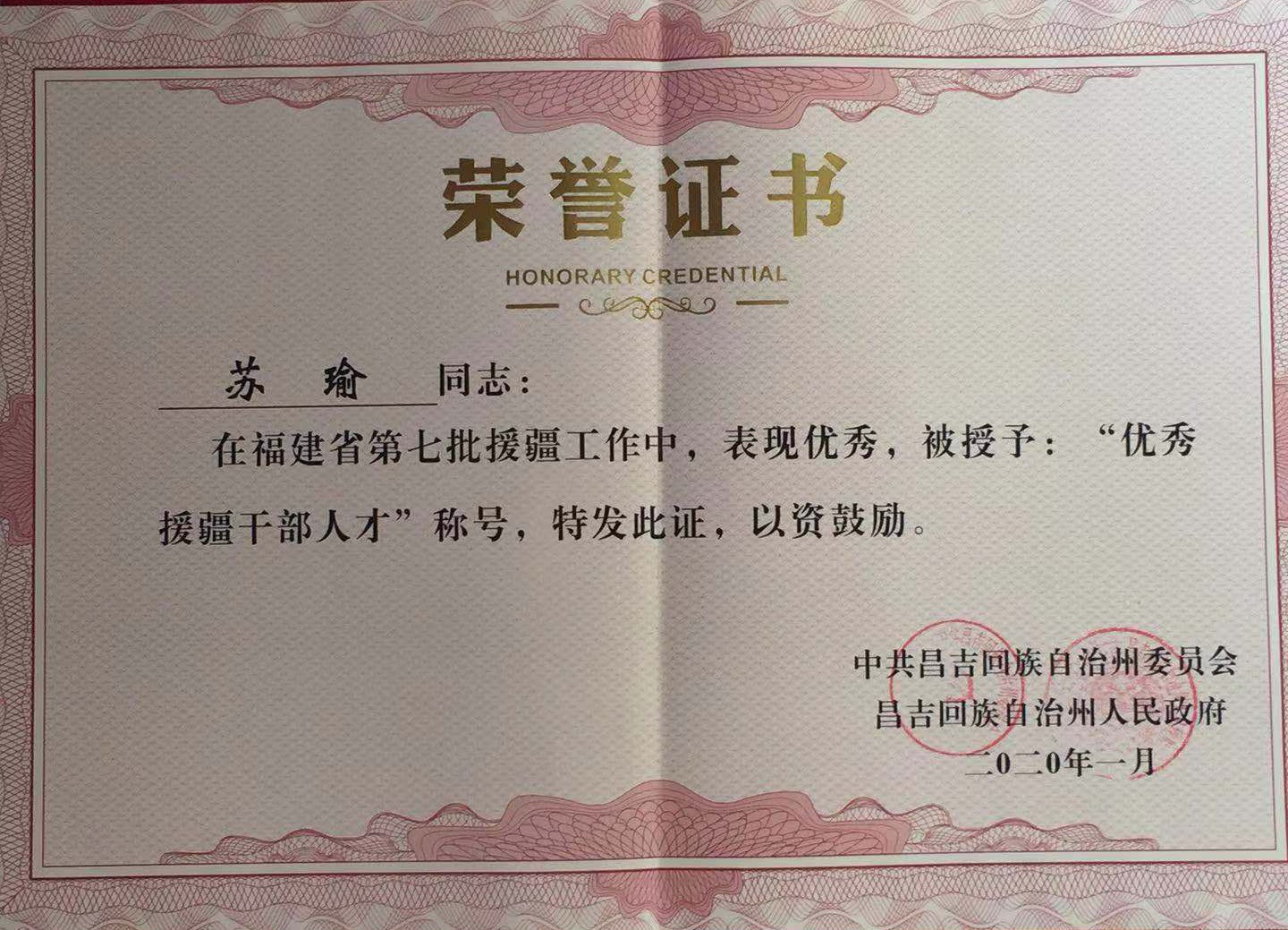 2018年8月,苏瑜作为福建省第七批援疆医疗队队员来到新疆昌吉州呼图壁县人民医院展开为期18个月的对口医疗援疆工作,主要以该院产科护理团队建设为主要帮扶内容。在陌生的地方,苏瑜克服南北差异带来的不适,充分发挥自身专业优势,结合呼图壁县人民医院的实际情况开展工作。在援疆工作时间里,苏瑜不负使命,将所掌握的知识和技能运用到护理工作中,出色的完成了各项任务,被中共昌吉州回族自治委员会、昌吉回族自治州人民政府评为“优秀援疆干部人才”称号,被中共呼图壁县委员会、呼图壁县人民政府评为“2018-2019年度优秀援疆干部”称号,收获了新疆昌吉州呼图壁县人民的信任和友谊。