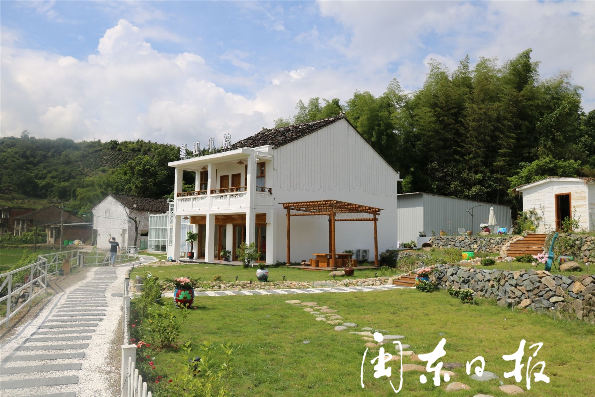大片稻田迎风摇摆,白墙黛瓦的特色民房点缀山脚。夏日时节,沿着福鼎市桐城街道董江村蜿蜒的村道一路前行,一副充满生机的田园画卷在眼前徐徐铺展。今年2月,从村里走出去的两代人回乡创业,用短短5个月时间打造出一个极富特色的农家梦幻小院,吸引游客纷至沓来,为昔日冷清寂寥的村庄注入了无限生机。