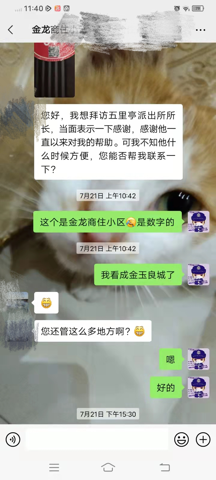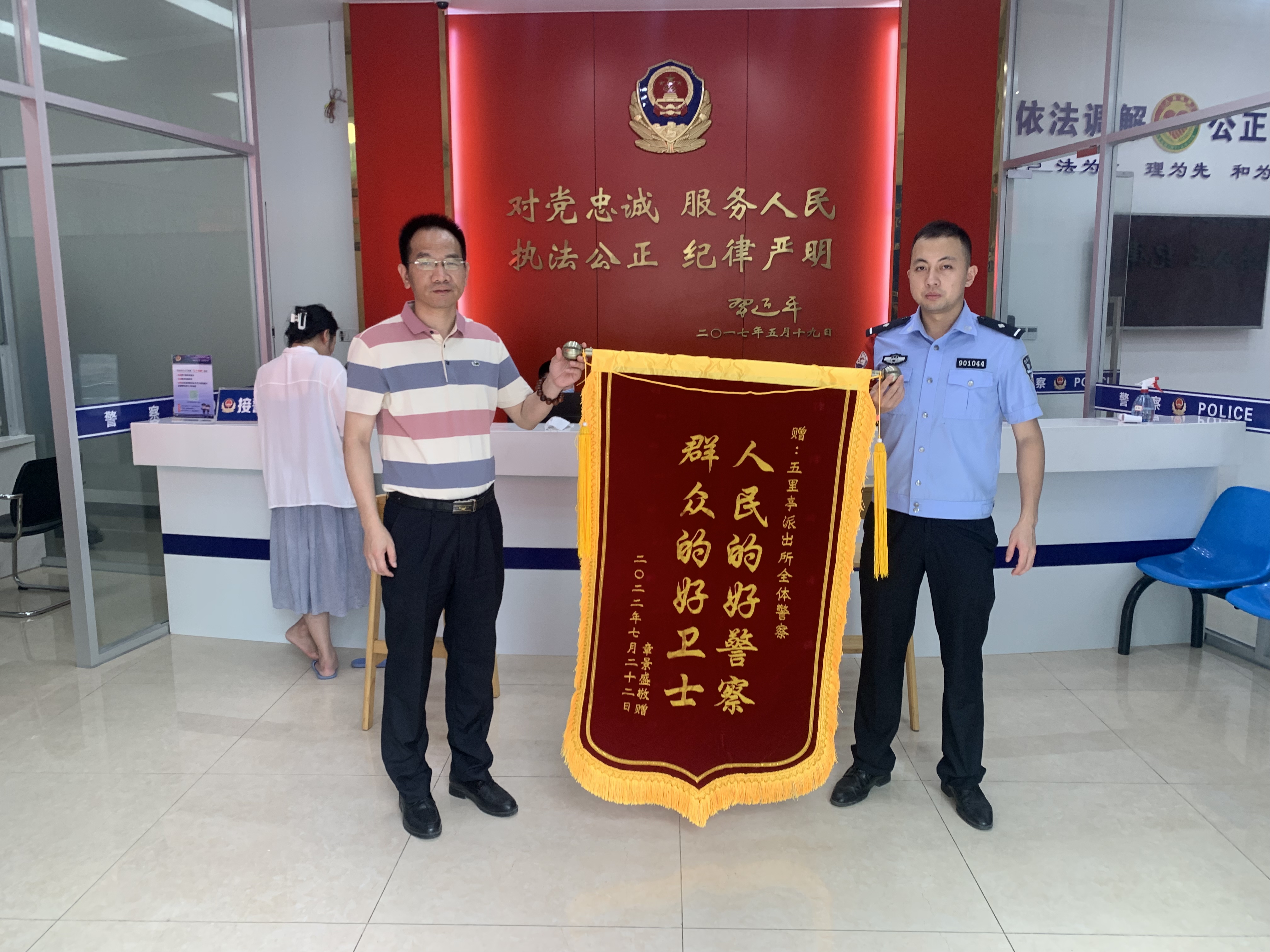 8月2日,辖区居民章某带着一面写有“人民的好警察 群众的好卫士”的锦旗来到五里亭派出所,感谢在五里亭派出所的积极作为让他们切实感受到了满满的安全感。 “我想拜访五里亭派出所所长,想当面表示一下感谢......”日前,辖区金龙纽约街居民章某通过警民微信群添加了社区辅警的微信,并发来消息。正在金龙纽约街走访的社区辅警立即致电所长石贤忠求证,却得知其不曾认识章某。随后社区辅警便根据章某提供的住址,前往章某家中了解情况。