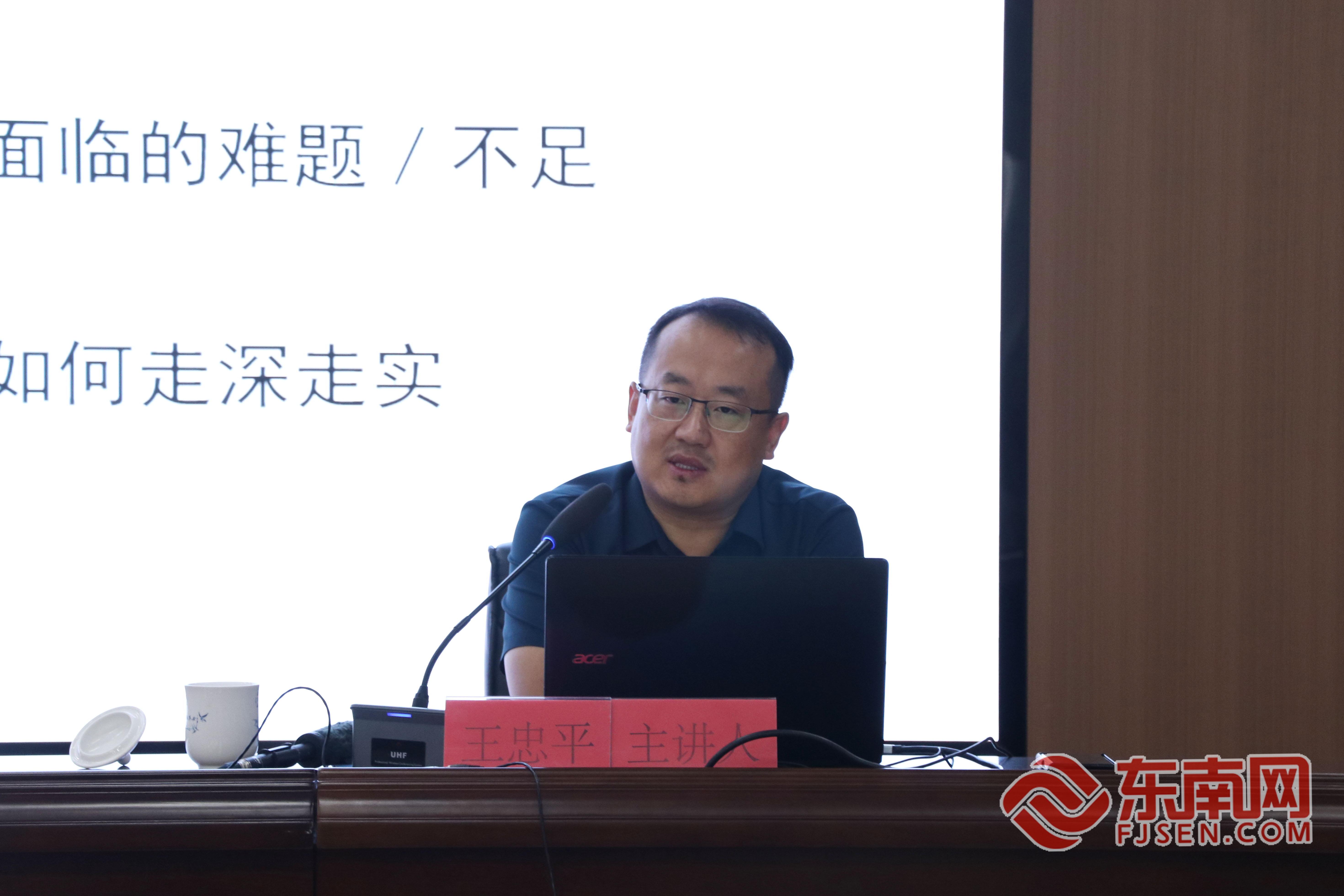 北京林业大学副教授王忠平。东南网记者 陈玲汇 摄 培训班邀请北京林业大学副教授王忠平,广东省团校(广东青年政治学院)教授谭建光,福建省志愿者协会副秘书长游立华为学员授课。王忠平以《推动新时代文明实践工作走深走实》为题,就如何进一步推动新时代文明实践工作走深走实,提出了解决的思路和办法,在如何融入中心工作,如何孵化培育组织和项目,如何进一步整合硬件和软件资源进行了深入的讲解。