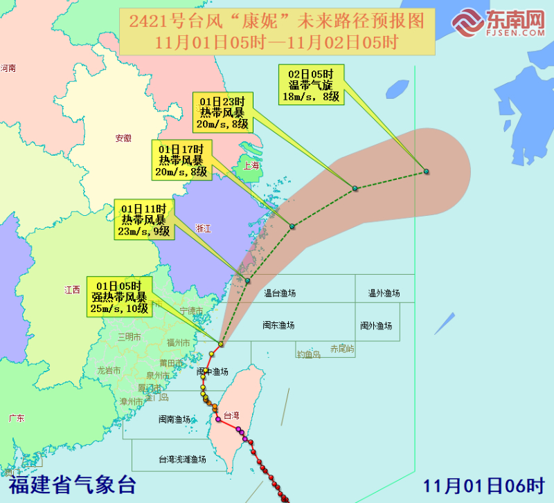 台风“康妮”路径预报 据气象部门统计,昨天(10月31日),宁德东部县市出现暴雨到大暴雨,局部特大暴雨;沿海海区出现9~10级、阵风11~12级大风。统计10月31日7时到11月1日7时,累计雨量共有6个县(市、区)的32个乡镇超过100毫米,其中蕉城、柘荣的3个乡镇超过200毫米,最大为蕉城飞鸾352.3毫米,其次为柘荣乍洋230.7毫米,城区最大为柘荣163.4毫米,1小时降水量最大为蕉城飞鸾51毫米。 今年第21号台风“康妮”今天7时中心距离浙江省温岭市南偏西方向约220公里(北纬26.5度、东经120.6度),中心附近最大风力10级(25米/秒,强热带风暴级)。预计,“康妮”将以每小时35公里的速度向北偏东方向快速移动,强度逐渐减弱。 今天白天,沿海海区和闽东渔场最大风力可达7~9级、阵风9~11级转6~7级、阵风8~9级;钓鱼岛海域、闽外渔场最大风力可达7~8级、阵风9~10级转6~7级、阵风8~9级。预计风力于今天中午开始减弱,夜间明显减弱。陆上大风方面,今天白天,沿海地区部分县市和陆上高海拔地区最大阵风可达7~9级。 今天全市阴有小雨到中雨,东部和北部县市有大雨,局部暴雨。预计今天傍晚起降水减弱停止,11月2至3日以多云天气为主。 受台风影响,今天白天宁德沿海海区和渔场大风灾害风险高,沿海县市的部分路段有一定的交通气象风险。气象专家建议,海上作业平台、沿海养殖及涉海、涉岛旅游需加强安全管理工作,同时需注意防范陆上大风对城乡基础设施的危害。同时,相关部门做好交通疏导和城市安全运行工作,特别关注陆上强风对高速公路和城市高架桥、跨海大桥等特殊道路段的不利影响。 |