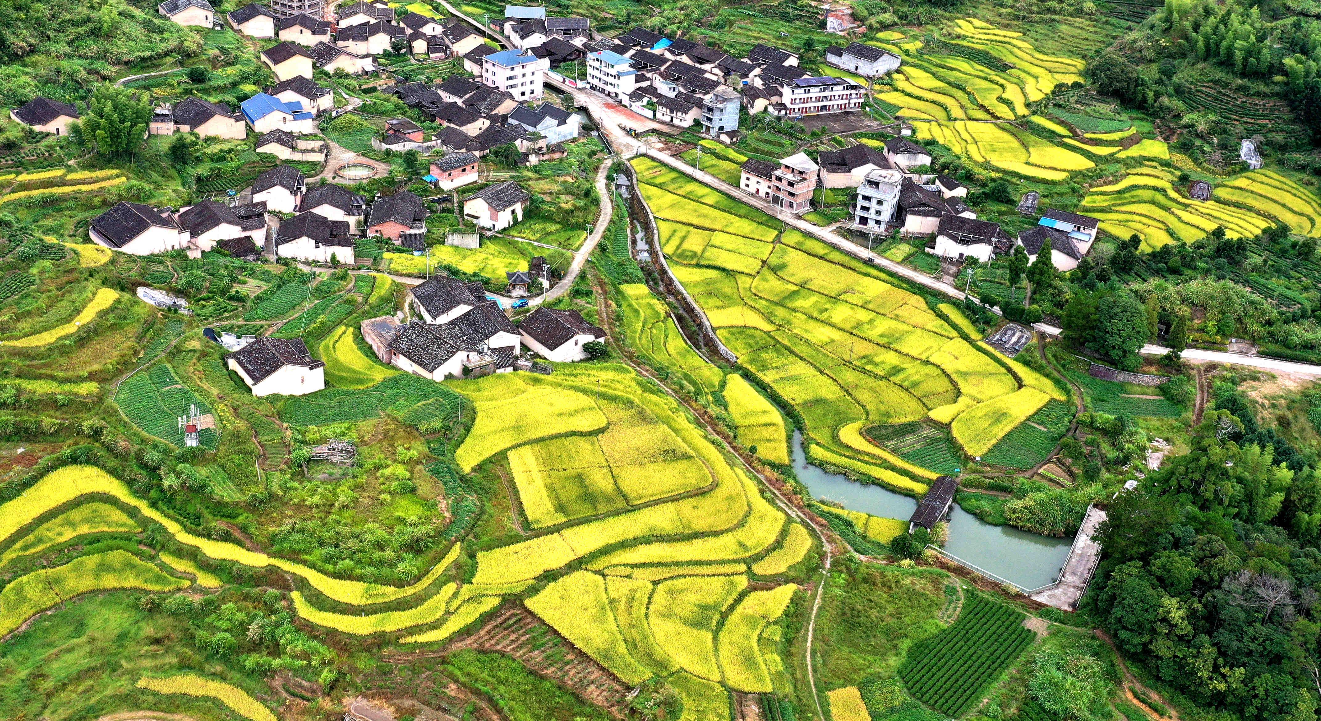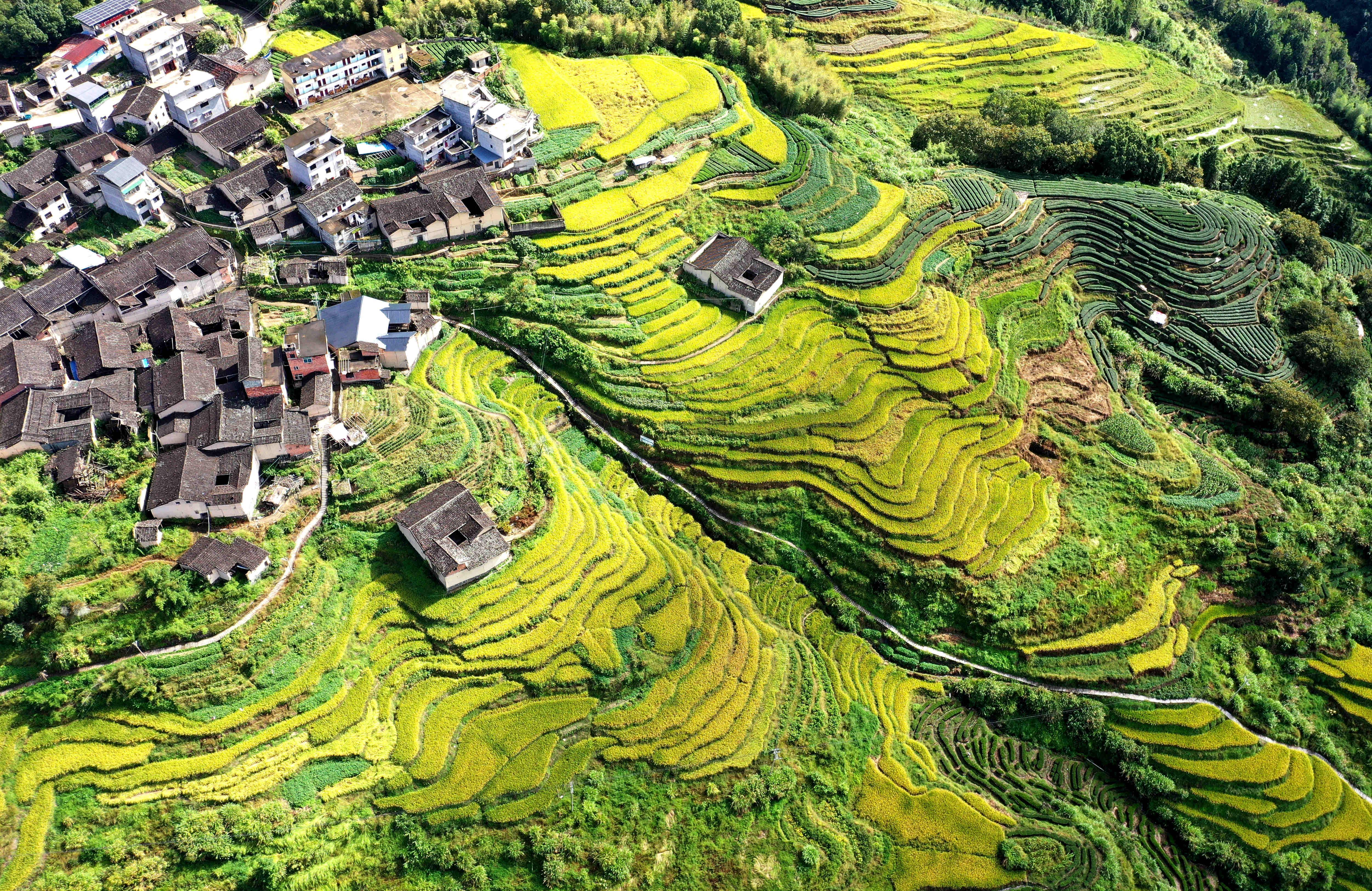 东南网9月26日讯(通讯员 吴苏梅 黄河)随着秋意渐浓,宁德市寿宁县托溪乡的乡村梯田迎来了一年中最富诗意的时节。层层叠叠的梯田如铺满大地的金色阶梯,黄绿交织的稻浪随风起伏,勾勒出一幅兼具自然之美与农耕之韵的乡村画卷。 走进位于高山小盆地的江山村,黑瓦黛墙的古民居与层层梯田相依相伴,构成了一幅浑然天成的乡土画卷。阳光下,稻穗泛着金黄的光泽,田埂上的杂草也染上了一层暖意,古民居的黑瓦在金黄稻田的映衬下,更显沉稳古朴。 而位于半山腰的阔丘村,梯田景观同样令人沉醉。这里的梯田更具层次感,部分地块还种了茶叶、薯类作物,五彩斑斓的作物为梯田增添了更多色彩。在无人机的屏幕里,这里的梯田从山脚蜿蜒至村子旁,线条错落有致,宛如大地精心编织的巨型锦缎,与上方错落分布的黑瓦民居融为一体,构成了一幅和谐静谧的乡村生态图景。 据阔丘村党支部书记介绍,近年来,村里在保护传统梯田的基础上,积极推广生态种植模式,采用生物防治、无人机飞防等绿色技术,既保证了粮食质量,也让梯田美景更具吸引力。“现在不仅粮食收成有保障,每到农忙或观景旺季,还会有不少游客来这里拍照打卡,带动了村里的农旅融合发展。” 当前,托溪乡各村的稻田已进入灌浆成熟期,沉甸甸的稻穗压弯了稻秆,呈现出一派丰收在望的喜人景象。托溪乡乡长黄斌表示,乡里已组织农技人员深入田间地头,为农户提供收割准备等技术指导,确保粮食颗粒归仓,助力村民实现增产增收。 |