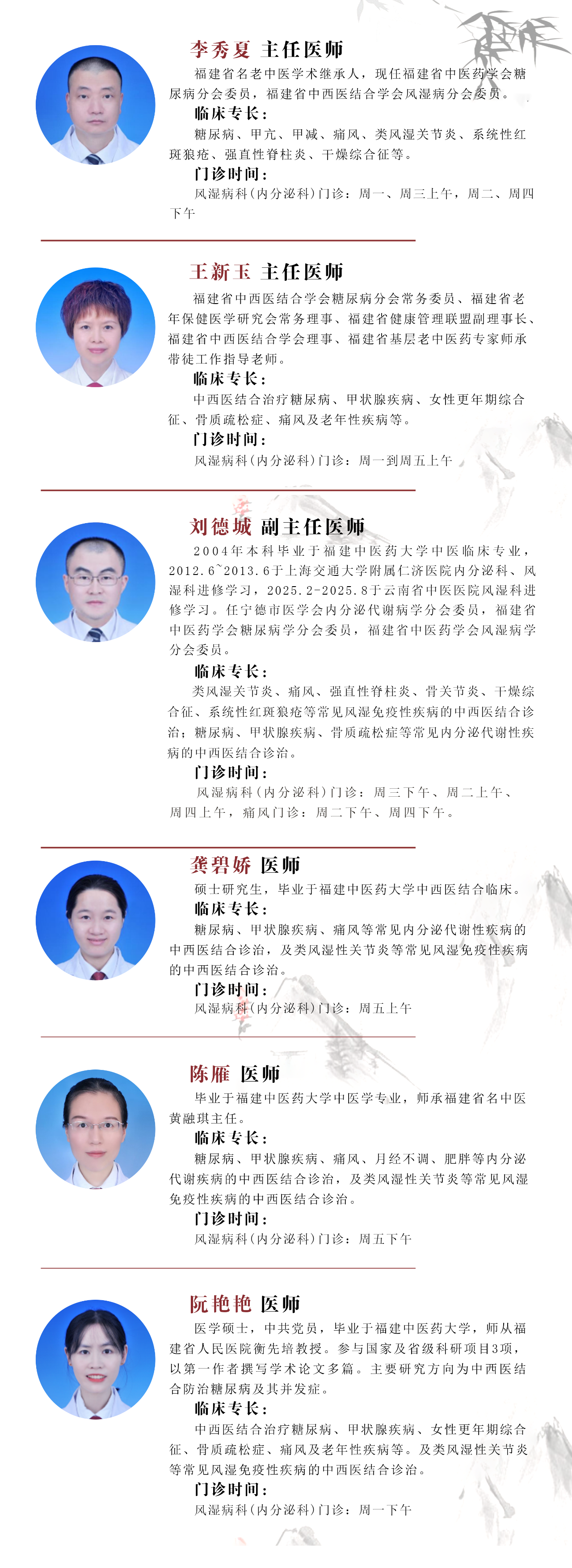 您是否曾在深夜被剧痛惊醒? 是否因关节刀割样疼痛影响工作和生活? —— 这可能是痛风在“突袭”您的健康! 宁德市中医院 开设了 痛风专病门诊 全流程护航,助您告别痛风困扰 关于痛风 什么是痛风? 1.痛风(Gout)是嘌呤代谢紊乱及/或尿酸排泄减少所引起的一种晶体性关节炎。临床表现为高尿酸血症和尿酸盐结晶沉积所致的特征性急性关节炎,痛风石形成,痛风石性慢性关节炎,并可引起慢性间质性肾炎,尿酸尿路结石等,严重者可出现关节致残,肾功能不全。痛风常与中心性肥胖、高脂血症、糖尿病、高血压以及心脑血管病伴发,流行病学调查显示,95%为男性,男女之比约20:1,由于经济发展,生活方式和饮食结构的改变,我国高尿酸血症及痛风的患病率直线上升,且呈年轻化趋势。 2.中医认识 中医学认为痛风系由湿浊壅阻,留滞关节经络,气血运行不畅所引起的多以趾、指等关节红肿、热痛为主要临床表现的一种病证,其发病与先天禀赋不足、脾肾亏虚及外感寒湿、湿热邪气、饮食不当等因素相关。 3.痛风的诊断 痛风的诊断需根据临床表现、实验室检查、影像学检查来综合判断。当患者以急性关节红肿热痛就诊,医生进行鉴别诊断,进行评分,基本能确定痛风发作。此外,医生将根据实际情况进行必要的血常规、肝肾功能、关节X线等检查,以辅助全面评估病情,据此选择最适宜的治疗方案。 中医药治疗痛风有哪些优势? 1.整体调理 中医药治疗高尿酸血症和痛风时,会综合考虑患者的体质、病因、病机等因素,制定个性化的治疗方案,以达到平衡阴阳、调和气血的目的,从根本上调理机体,减少尿酸的生成和沉积。 2.未病先防 针对单纯高尿酸血症或痛风的病人,不仅在痛风发作急性期以消肿止痛、清热解毒治疗,在高尿酸血症阶段健脾补肾、化痰祛瘀治疗,更注重对肾脏损伤的提前处理和预防。 3.中药内服 针对患者病证特点,辨证施治,结合清热健脾利湿、活血化瘀等功效的中药,可有效降低尿酸水平、减轻疼痛,对于已经出现肾功能减退的患者,具有延缓疾病进展、保护肾脏功能,同时可减轻西药的不良反应等重要作用。 4.中药外治 采用中药外敷、中药熏洗、穴位敷贴等快速缓解关节红肿热痛,改善患者症状。 门诊时间、地点和预约方式: 门诊时间:周二下午、周四下午 门诊地点:宁德市中医院门诊大楼痛风专病门诊。 预约方式:1.线上预约:关注宁德市中医院公众号,点击就诊服务→预约挂号→专病门诊→痛风专病门诊。2.现场预约:宁德市中医院自助服务机进行预约。 宁德市中医院风湿病科(内分泌科)痛风专病门诊专家简介 |