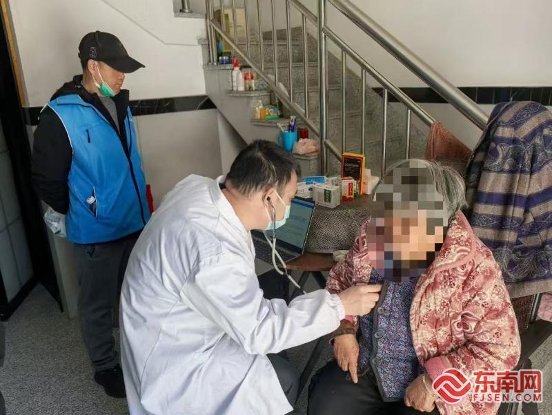 医生入户为行动不便老人开展体检服务。福鼎市桐城社区卫生服务中心供图 诊疗现场,医生们携带便携式检查设备,为居民细致量血压、测血糖,详细询问病史与用药情况,针对常见慢性病给出详细诊疗方案;药房工作人则同步核对处方、分发药品,手把手指导居民正确用药,避免错服、漏服。