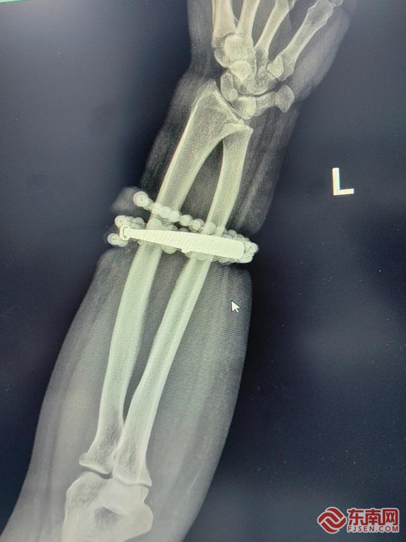 患者图。闽东医院供图 黄其龙说,团队面临的挑战在于患者局部感染严重,组织脆弱,异物材质坚硬且位置深陷,常规摘取方式已不适用,必须通过外科手术取出。经科学讨论,相关科室迅速制定周密手术方案,在加强抗感染治疗后,为患者实施“前臂异物取出术+清创术”。手术由主任医师张申申主刀,在臂丛麻醉下进行。术中可见增生的肉芽组织和炎性组织已完全“吞噬”手镯。手术团队如“考古发掘”般细致操作,沿手镯与串珠轮廓,逐步分离粘连的皮肤及皮下组织。整个过程力求精准,以保护周边重要血管和神经。
