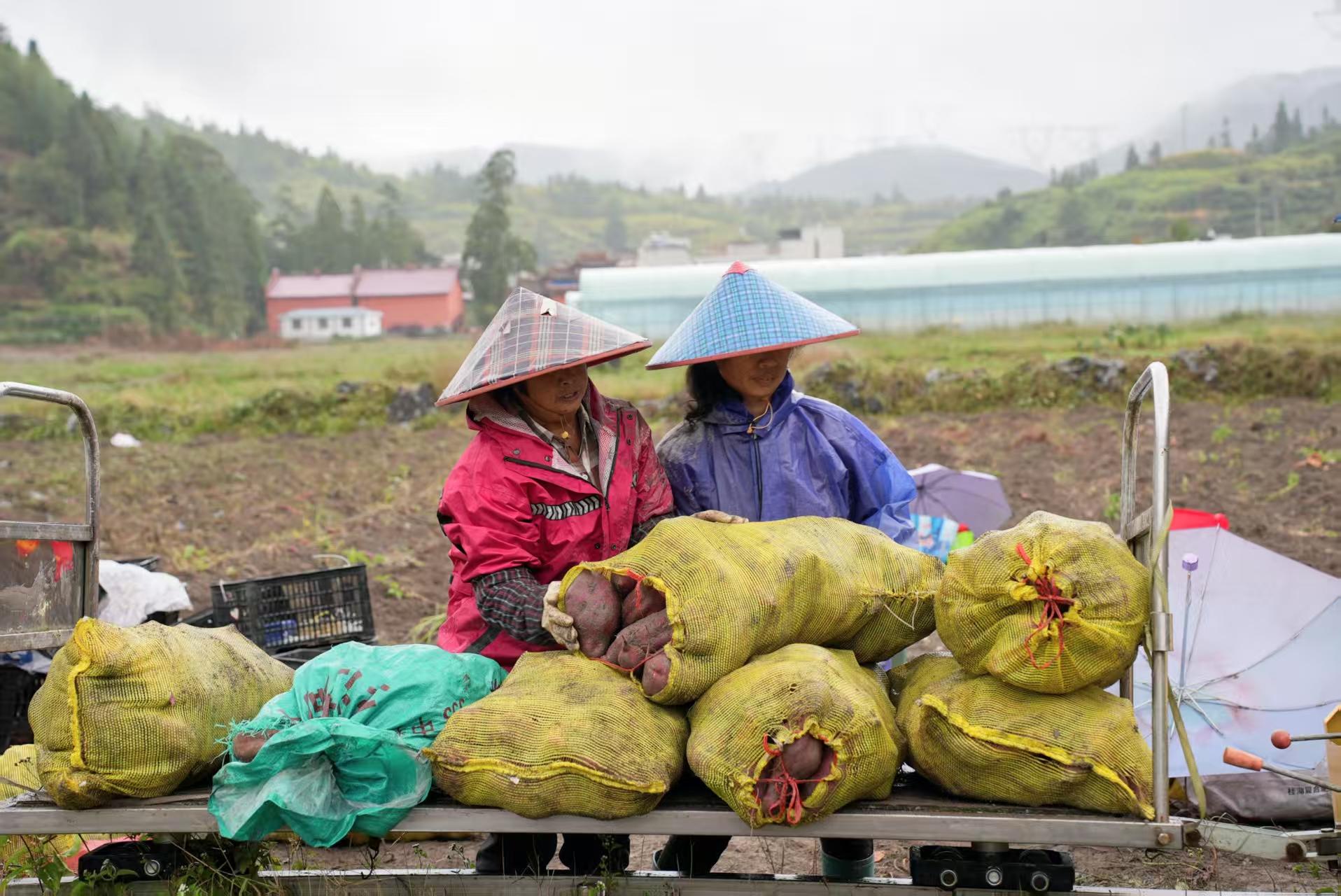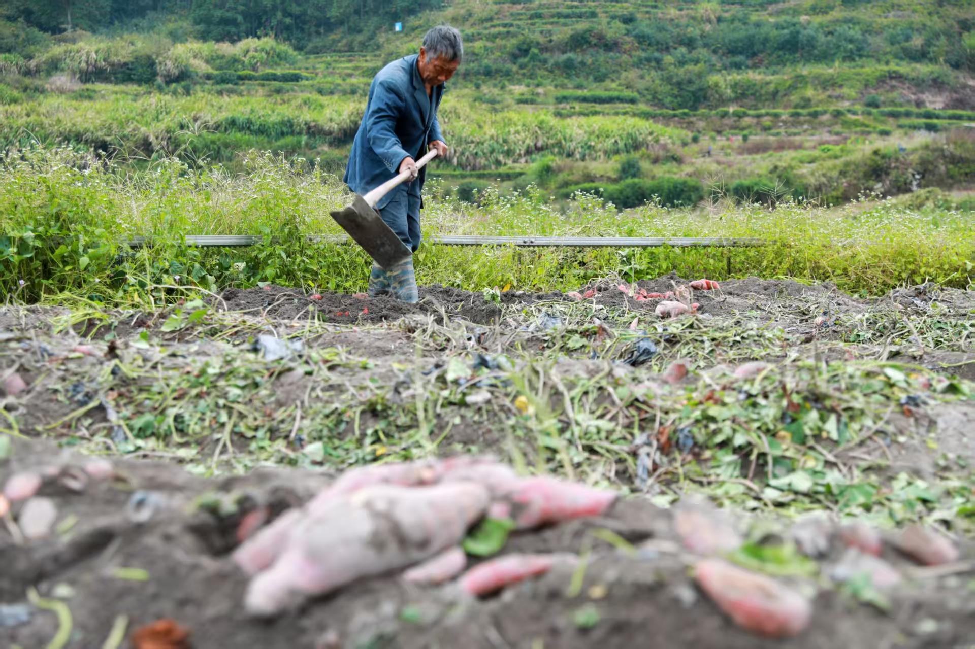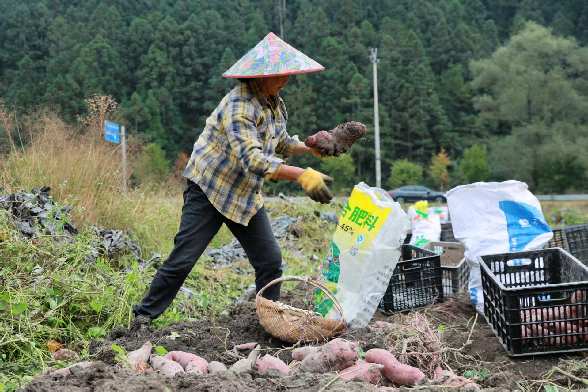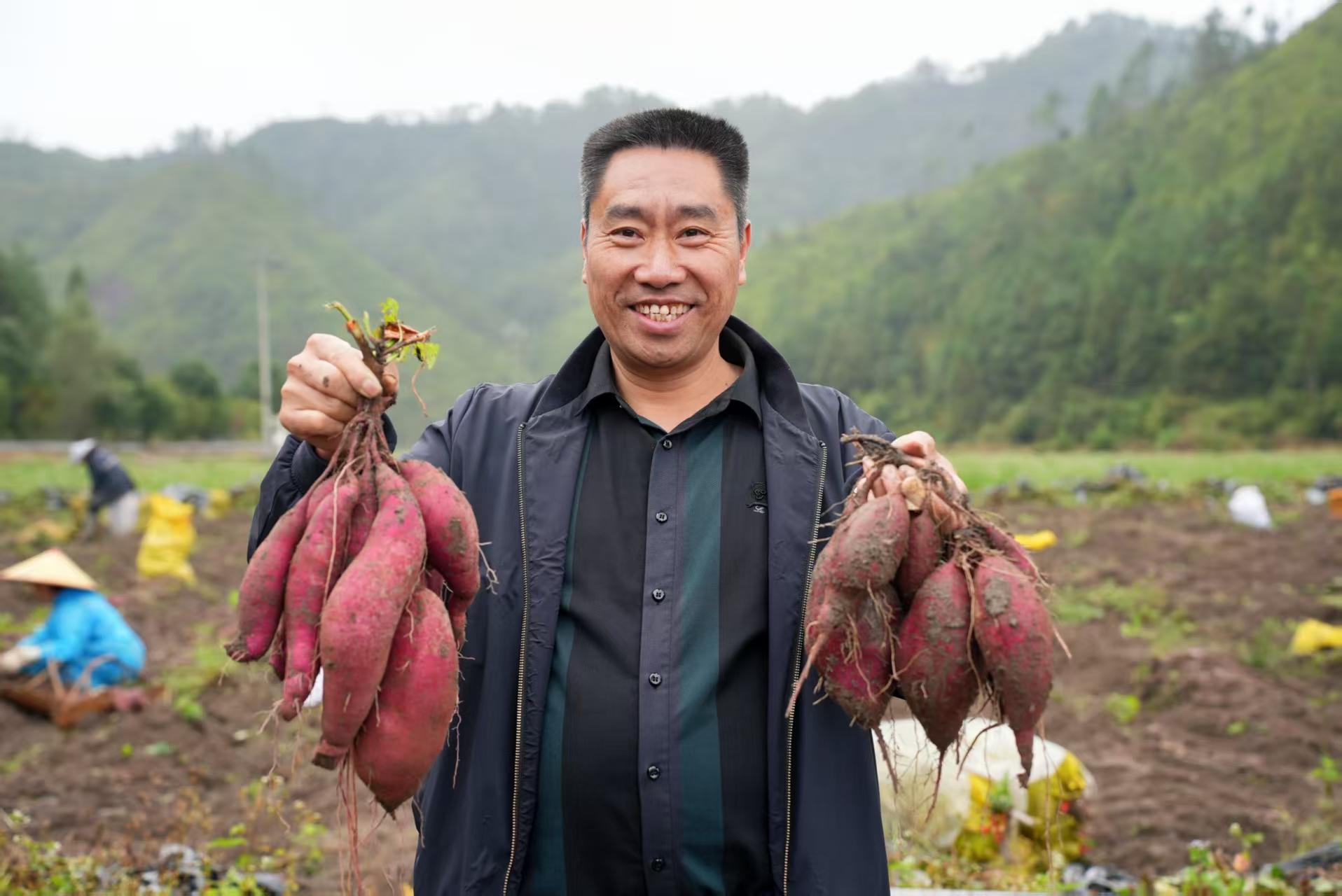 图为工人正采收蜜薯 汤文娟 摄 周宁自然条件得天独厚。其适宜的温湿度与显著的昼夜温差,拉长蜜薯生长期、让糖分足积,成为种植的天然条件。依托这一优势,2021年起,露香源农业率先引进“普32”“红瑶”“玛莎莉”等优质蜜薯品种试种,正式开启蜜薯种植探索之路。经过几年的培育与积淀,2023年,福建露香源农业科技有限公司成立后便迅速成长为当地农业“领头雁”,并在200多亩土地上开展蜜薯、马铃薯、玉米轮种模式。此外,还通过“党支部+合作社+公司+农户”模式,带动周边村落50余户农民加入蜜薯种植队伍,发展形成500多亩合作种植规模,让村民共享发展红利。