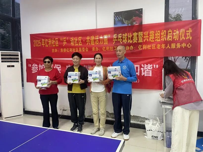 在团体赛环节,参赛队员们相互配合、默契十足,时而精准传球,时而协同防守,每一个战术配合都展现出团队的凝聚力。当一方队员出现失误时,队友及时给予鼓励;当打出精彩配合得分时,大家击掌庆祝,充分展现了邻里间互帮互助、团结协作的良好风貌。经过激烈角逐,比赛最终决出冠亚季军。裁判宣布获奖名单后,并依次为队伍颁发奖品。随后,在社区的组织下,现场居民积极响应,纷纷扫码加入组织交流群,“亿利乒乓球兴趣组织”正式成立。
