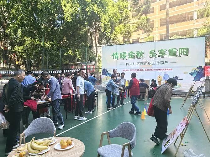 侨兴社区 10月29日,侨兴社区在多功能广场举办“情暖金秋・乐享重阳”退休职工游园会。活动现场设置了猜灯谜、夹弹珠等趣味游戏,邀请民警开展防诈宣传,还给老人们准备了丰富的水果点心,大家积极参与,在欢声笑语中共度佳节。