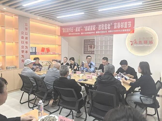 富春社区 10月28日,富春社区举办“情暖重阳・致敬耆老”重阳邻里节。活动邀请社区退休老人及退役军人代表参加,在益智游戏区,老同志们全神贯注、积极参与;在反诈宣传展位前,他们认真记录要点并踊跃提问。此外,社区工作人员也与大家围坐交流,仔细倾听大家的生活需求与建议。现场氛围融洽,欢声笑语不断。