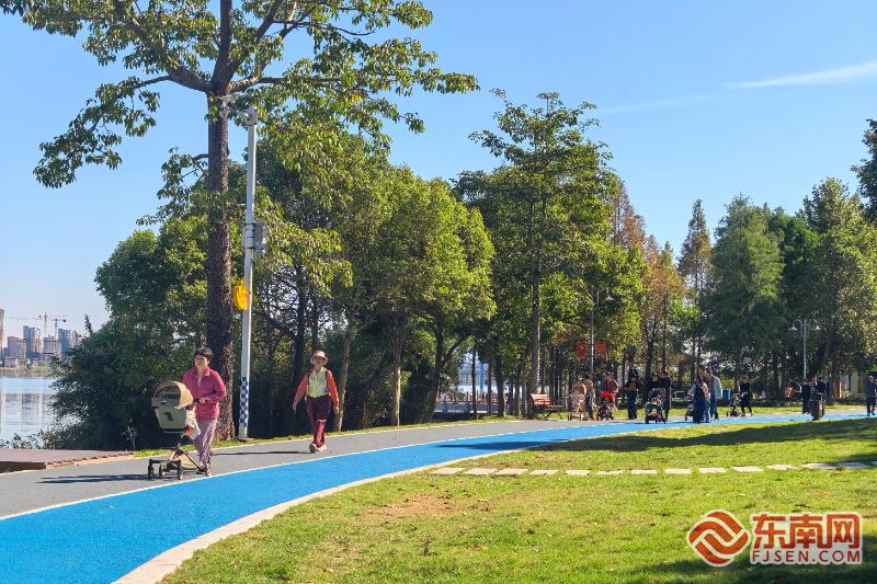 新建的环湖塑胶跑道。东南网记者 叶伏国 摄 本次提升工程最大的亮点之一是彻底贯通全长约10公里的环湖塑胶跑道,通过新建路段、打通断点,将原先不连贯的路径连接成一条无缝衔接的“活力环”,不仅为跑友提供了绝佳场地,也成为串联南北岸公园风景的观光纽带。 除了贯通环湖路,工程还大胆实施“呼吸式改造”,通过抽疏沿岸过于郁闭的林木,巧妙“拆墙见湖”,将昔日阻挡视线的“绿化围墙”变为展示湖光山色的“生态画框”,实现了“推窗见湖、城湖共呼吸”的愿景。 同时,项目注重提升亲水互动体验,新建的亲水平台、蜿蜒栈道以及专为儿童设计的无动力乐园,将湖岸线升级为一个可玩、可憩、可观的全龄化互动空间,让各年龄段的市民都能找到乐趣。