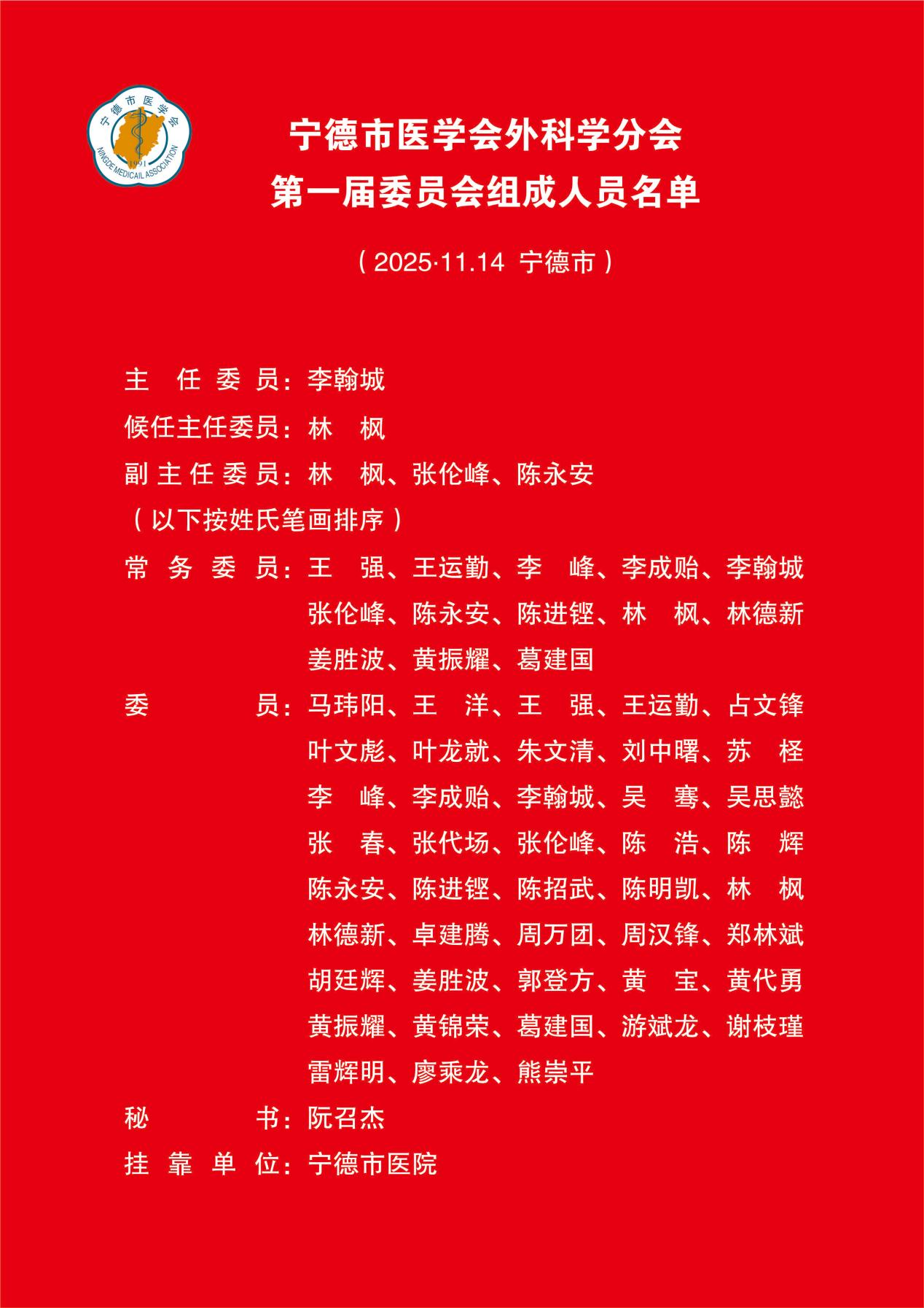 新当选的主任委员李翰城表示,感谢全体委员的信任与支持,外科学分会将充分发挥分会学术交流桥梁纽带作用,团结带领全体委员及全市外科同仁,加强协作、深耕学术,提升宁德市外科诊疗水平,更好地服务人民群众,为健康宁德做出应有的贡献。