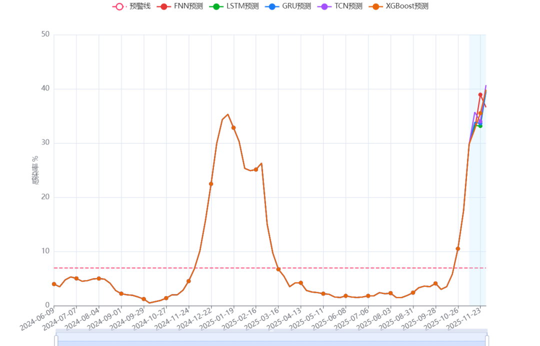 厦门大学科研团队的全国流感样病例预测模型结果显示,门急诊流感样病例中流感病毒阳性率已超出预警线,我国流感活动已进入上升期,未来数周流行强度将持续增强(图2)。
