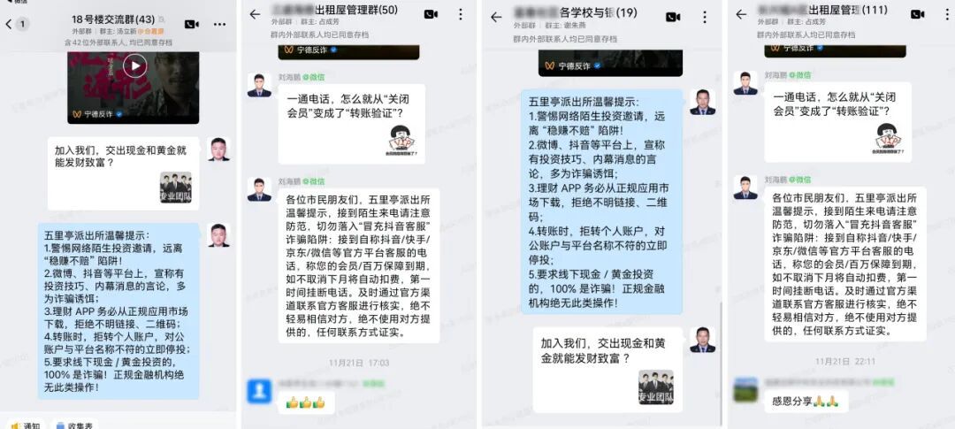 第二招:科技预警,“点对面”覆盖诈骗高发区 光靠民警两条腿跑还不够,派出所以科技赋能跑出反诈“加速度”!针对刚发生的诈骗警情,紧急协调移动运营商,以案发地为中心,向周边区域居民精准推送防诈预警短信。同时,各小区微信群瞬间变身“反诈前沿阵地”,民警实时推送生动易懂的反诈短视频和警示链接,确保预警信息无死角、全覆盖触达每一位居民。