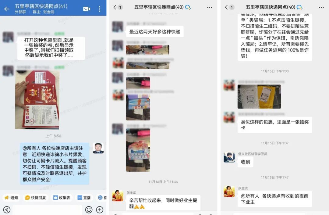 第三招:警企联防,“源头端”拦截千件诈骗快递 “您有一个‘年终大奖’包裹待签收?”——小心!这可能是骗局的开始!面对虚假包裹诈骗高发态势,五里亭派出所依托“福建警民e家”企业微信平台,创新建立覆盖全区40余家快递站点的警企联防群。