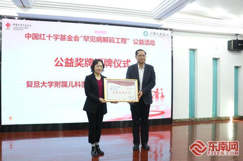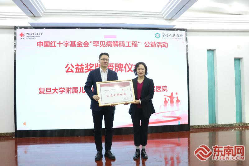 李倩为宁德人民医院授予“公益先锋机构”牌匾。东南网记者 周涛 摄 杨泰在致辞中对项目启动表示祝贺,向复旦大学附属儿科医院领导专家的到来表示欢迎和感谢。他表示,中国红十字基金会将罕见病公益项目落地蕉城,并邀请顶尖医疗机构专家参与,为罕见病患者点亮希望,是民生福音更是有力支持。蕉城区将全力支持项目推进,以项目为契机提升罕见病防治和救助能力,同时呼吁社会各界凝聚力量,构建协同高效的防治网络。