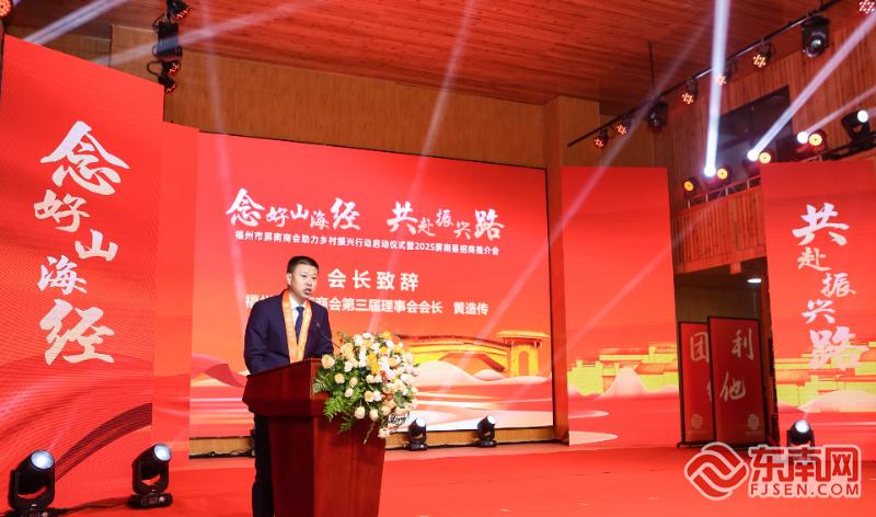 福州市屏南商会会长黄造传致辞。主办方供图 屏南地处闽东山区,平均海拔830米,生态绿美清新,不仅坐拥丰富生态资源、特色农业物产,更有众多底蕴深厚的传统村落,是充满发展潜力的热土。