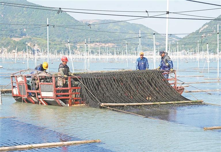 眼下,福鼎市万亩头茬紫菜进入采收期,当地养殖户正抢抓晴好天气,开展紫菜采收及加工作业,蔚蓝的海上田园喜绘丰收画卷。 在沙埕镇环敏灶湾海域,一根根玻璃钢撑杆围出了连片的紫菜养殖网格,墨色的紫菜如丝绒般在海水中随波轻漾,在阳光下泛着油亮的光泽。养殖户驾驶着采收船穿梭于“海上阡陌”之间,随着收割机轰鸣运转,一帘帘的紫菜转眼便落入船舱(左图)。 目前,福鼎市共有紫菜育苗室27家,紫菜养殖面积2.2万亩,初加工企业89家,精深加工企业2家,2024年全产业链产值达20余亿元。(闽东日报 杜应影 夏岩缘 邱明翔 文/图) |