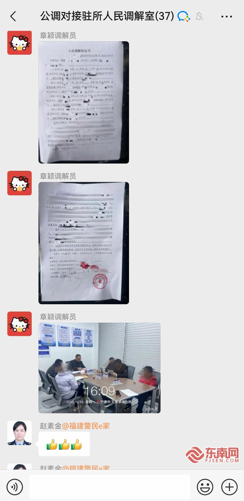 “公调对接驻所人民调解室”警民e家工作微信群。东侨公安供图 线上线下联动,群内信息滴答作响,线下调解会也接连开展。历经多轮沟通,12月15日,三方终于达成一致并签订调解协议。调解员随即将协议照片上传至工作群,获得社区干部与志愿者线上点赞。 近年来,五里亭派出所积极践行“新时代枫桥经验”,推动“亭好·联合调解”体系不断升级。通过警民e家微信群,实现信息即时互通、资源高效整合;借助“四级联调+保险托底”模式,提升纠纷化解效率与温度。此次保洁车撞人纠纷的成功调解,正是科技赋能与多元共治深度融合的生动体现,展现了基层社会治理的智慧与温情。 |