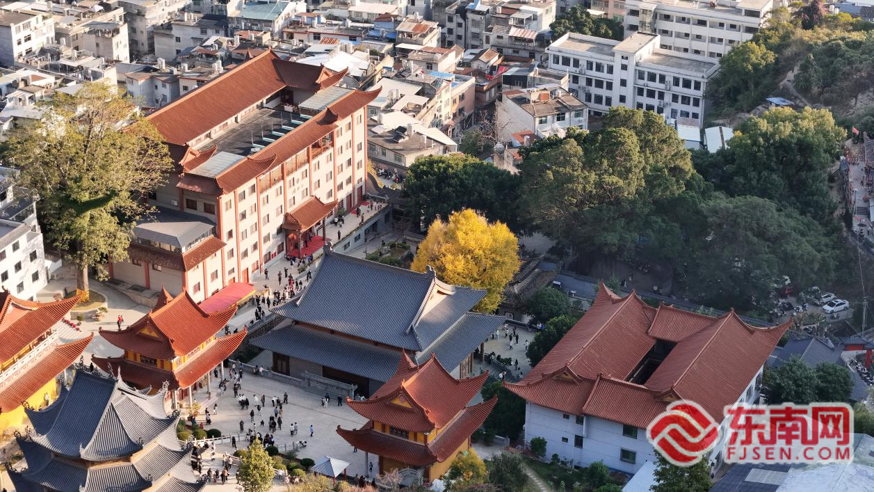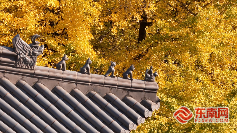 银杏金叶将清寂的寺院映衬得暖意融融。张羽 摄 被誉为“八闽第一古刹”的建善寺始建于南齐永明元年(公元483年),历史底蕴深厚,迄今已有1500多年的历史,是福建省现存年代最久远的佛寺之一。寺中这棵银杏树历经岁月,每到深冬时节便如期换上“金装”,成为当地独特的季节性景观。