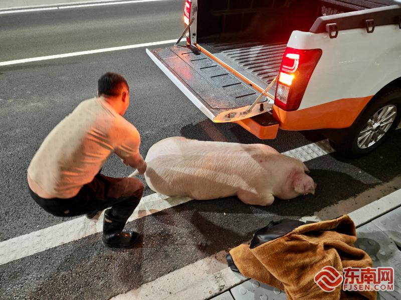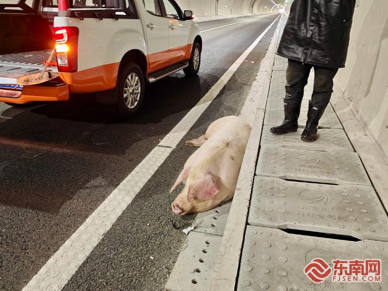 生猪滚落车道。省高速集团宁德公司供图 事发现场,养护人员了解到,因货车围挡护栏损坏,共四只生猪跌落,其中一只因高处坠落骨折,躺在隧道路侧无法动弹,其余三只受到惊吓,已经窜出高速公路,跑上了附近的国道。