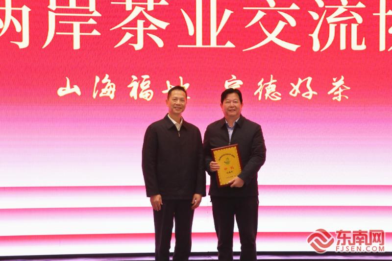 海峡两岸茶业交流协会会长林钟乐为新当选会长刘国平授牌。东南网记者 叶伏国 摄 “这次大会,是在茶产业进入由量变向质变跨越、加快转型升级的高质量发展关键阶段召开的一次重要会议,必将为宁德市茶产业高质量、可持续发展注入持久动力。”海峡两岸茶业交流协会会长林钟乐在致辞中表示,宁德作为福建茶业重要板块,承载着中国茶走向世界的历史记忆,更肩负着新时代茶业高质量发展的使命。他强调,新成立的协会应在"三茶"统筹发展中发挥更大作用,尤其在全国白茶、红茶领域强化行业影响力,推动宁德茶产业持续健康发展。