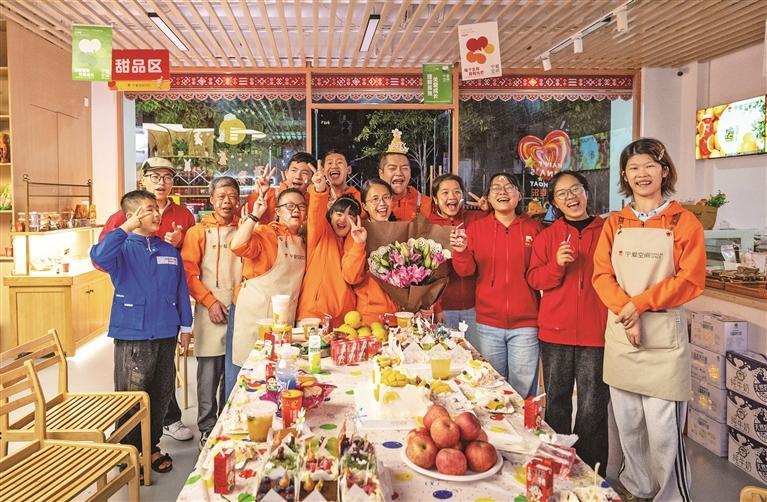 “宁爱·阳光助残共创空间”里的温暖时光。王志凌 摄 在众多就业服务平台中,“宁爱·阳光助残共创空间”格外引人注目。这个近200平方米的空间,位于蕉城区金溪南苑,是宁德市首个以“文化赋能+商业反哺”为特色的助残共创平台。在共创空间的“宁爱好物”寄售区,整齐摆放着残障朋友创作的剪纸、编织的钩花等手作产品。“目前,共有28名残疾青年在此就业,其中,心智障碍患者23名、肢体残疾人3名、听障人士1名、语言障碍人士1名,年龄最大的43岁。”店长黄锦团告诉记者,除了手作寄售,空间还提供茶饮休憩、社区活动、政策咨询等服务,为残疾青年搭建起实现价值的舞台。