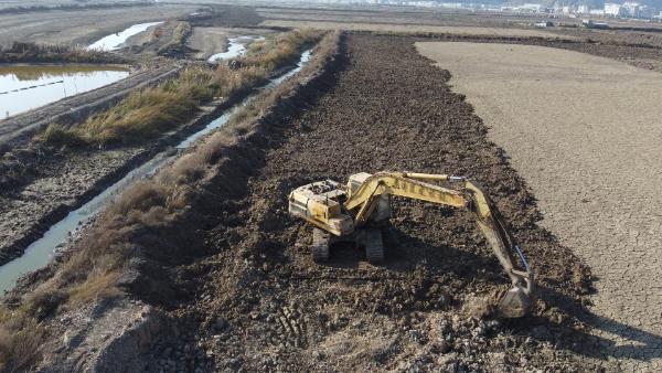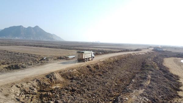 现场,运输车在田间道路来回奔跑,带起阵阵尘烟,为现场忙碌的挖掘机源源不断输送原料,高效完成塘面填平作业。