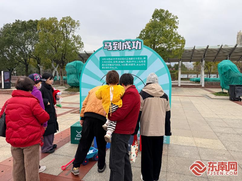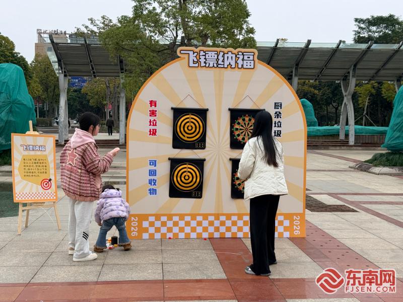 体验趣味关卡。东南网记者 周涛 摄 活动现场年味浓郁、暖意融融,马年元素与环保标识随处可见,互动打卡纳福区、循环商店区、手工体验区三大板块同步开放,吸引了众多市民尤其是家长带着孩子前来参与,欢声笑语不断,成为新春里一道独特的绿色风景线。在互动打卡区,“祥马辨类”“飞镖纳福”“马到成功”等趣味关卡前排起了长队,孩子们佩戴着可爱的马形头饰,或在展板前认真辨别垃圾类别,或手持飞镖瞄准分类靶盘,或推着小推车快速完成垃圾“搬运投放”,每完成一个关卡,就能收获一枚“福币”,脸上洋溢着收获的喜悦。家长们则在一旁耐心指导,陪着孩子一起闯关,在互动中共同学习垃圾分类知识,纠正日常分类误区。
