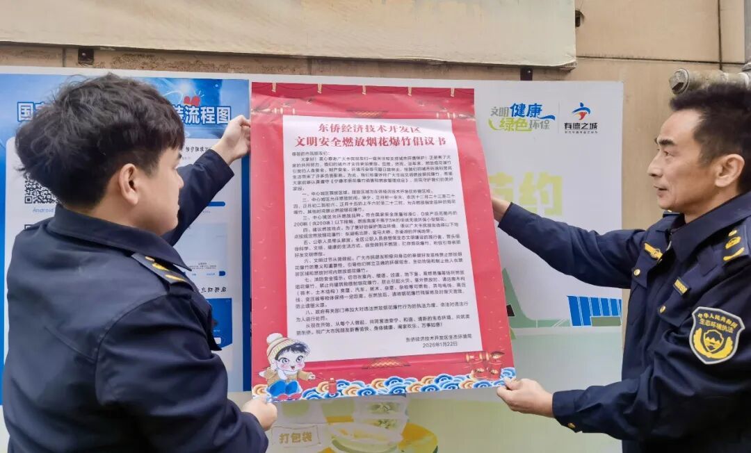 1月30日上午,东侨生态环境局联合东侨应急管理局、公安分局、市场监督管理局、城市管理执法大队等部门,开展春节期间烟花爆竹管控宣传活动。本次宣传活动主要针对中心城区内烟花爆竹燃放管控的重点区域,实现逸涛小区、冠宏星小区、新世纪花苑小区等居民住宅区全覆盖管控。各部门工作人员通过张贴倡议书、现场解读等方式开展宣传引导,向群众普及禁燃范围、时段及相关规定,截至目前,全区累计发放宣传资料200余份,张贴宣传倡议书40余张。同时组织辖区各社区开展线上宣传工作,依托社区微信群、辖区LED显示屏、小区业主群等平台,以图文解读、短信发送等形式,让禁燃理念深入人心。