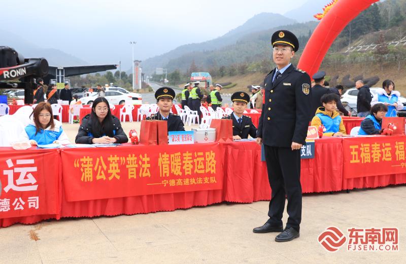 东南网2月2日讯(本网记者 周涛) 2月2日上午,宁德高速执法支队、宁德高速交警支队、省高速集团宁德管理分公司、省经开宁德分公司、宁德市卫健委、宁德市保险行业协会、市属各保险公司等多家单位,在甬莞高速林厝服务区(A区)主会场联合开展2026年春运启动仪式,同步在宁德北征管所外广场、甬莞高速沙埕湾服务区、五华山服务区广场设置分会场,围绕“五福春运,福通八闽”主题,通过交通主题宣讲、普法宣传及志愿服务等多元化内容,全力打造平安、便捷、温馨的高速公路通行环境,正式拉开宁德高速春运保障工作的序幕。