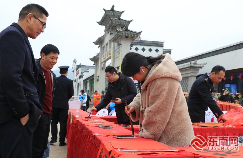 书法协会会员挥毫泼墨,现场书写新春春联、福字赠送给司乘人员。东南网记者 周涛 摄