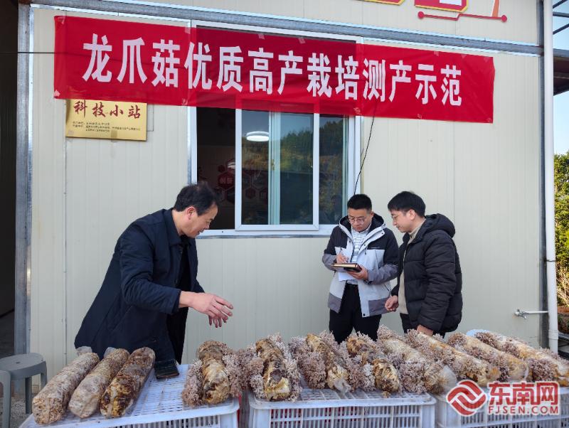 古田县科技特派员阮毅查看龙爪菇长势情况。古田县融媒体中心 供图 测产现场,古田县科技特派员阮毅带着团队蹲在菌架旁,手里的记录表写得满满当当。为确保数据精准,他们在菇房前、中、后不同区域随机抽取12袋菌棒,逐一采收、称重、分级,并开展感官评价。