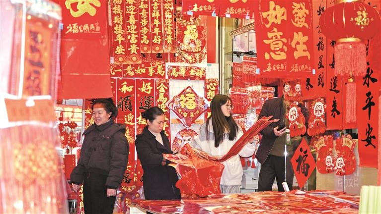 春节临近,宁德中心城区年货市场渐热。2月5日,记者来到八一五东路、环城路,发现不少商铺悄然换上“红装”,开启“年货模式”,红灯笼、春联、中国结、福字……各式各样的新年装饰将商铺装点得红红火火,街巷内外年味升腾。(闽东日报记者 陈容 摄)