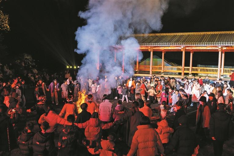 村民与游客围着篝火载歌载舞 下午3时许,身着盛装的畲家姑娘唱起山歌,畲族传统婚俗活动率先拉开帷幕。几番对唱、饮酒后,拜堂仪式在古朴的舞台上举行。新郎行跪拜礼,新娘只作揖而不跪——乃畲族“男跪女不拜”之古礼,相传源自畲族始祖三公主的尊贵身份。 据悉,婚俗表演取材于畲族婚嫁迎娶风俗,演出环节中的迎亲、拦门、拜天地、入新房等场景,再现了畲族传统婚俗,为新春佳节增添了喜庆氛围。
