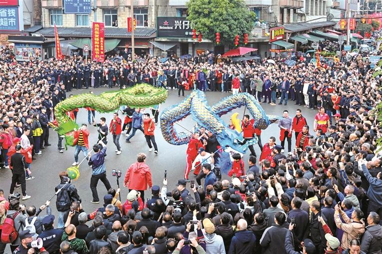 当日上午8时许,穆阳镇中心街区已是人潮涌动,管乐队、旱船方阵、彩灯方阵、战鼓方阵等队伍沿街巡游,精彩的舞龙表演更是赢得阵阵喝彩(上图),让现场观众大饱眼福。踩街过后,开春赶墟正式拉开大幕。来自十里八乡的农户和商贩早早将各类物品运到街边售卖,市民游客在选购过程中体验乡村集市的繁华与“淘宝”的乐趣,尽情感受这份独特的烟火气息。(记者 缪星 通讯员 钟艺 李郁 文/图) |