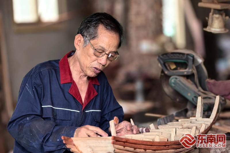 刘细秀正在打磨福船模型。东南网记者 叶伏国 摄 刘细秀是福船技艺的第二十代传人,13岁那年,他跟着父亲拿起刨子、斧头,一学就是一辈子。46年的从业生涯里,他手绘的福船图纸堆了满满一柜子,足有上千份,亲手造过的福船更是多达上千艘,在业内,大家都敬重地称他为“总师傅头”。 聊起自己最得意的作品,刘细秀的眼睛会瞬间亮起来——那是他主导建造的世界最大可航海仿古福船“福宁号”。这艘长41.6米、宽12米的大船,从头到尾都严格遵循古法:12道隔舱板整齐排布,用桐油、麻丝混合海蛎灰细细艌缝,钉子交叉钉入以平衡受力,每一道工序都复刻着古人的造船智慧,把水密隔舱的核心工艺完整地复原了出来。