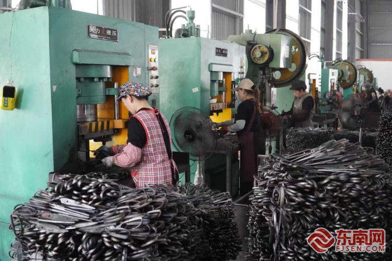 福建柘荣张小泉智能金属制造有限公司生产线。陈栩涛 摄 在柘荣双鹏刀剪有限公司生产车间,数控冲床、油压机、固化机、数控钻床等设备高效运转,项目全面建成投产后,预计年产剪刀1600余万把,提供就业岗位150余个。