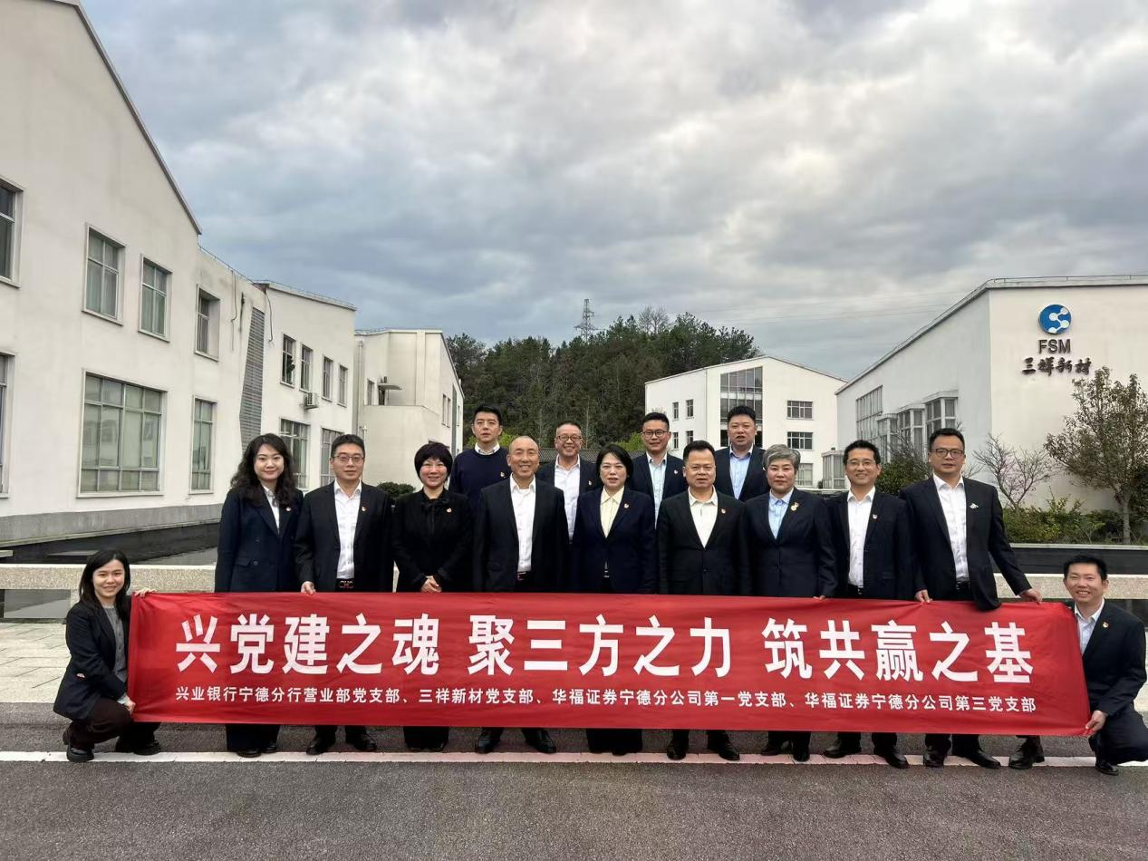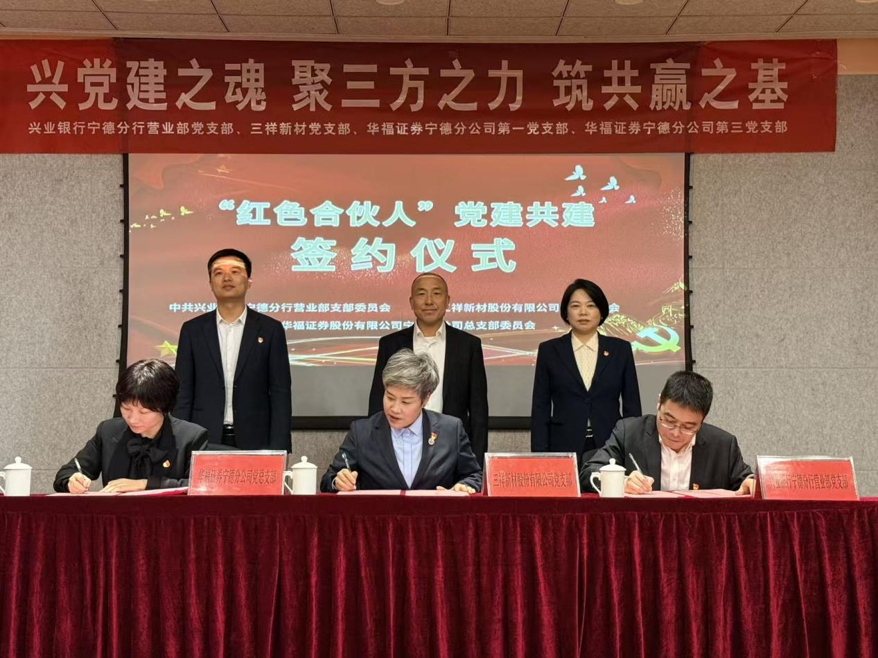 为深入推进党建与业务深度融合,搭建银、企、证三方协同发展平台,凝聚服务地方实体经济发展合力,2026年3月18日,兴业银行宁德分行营业部党支部、三祥新材股份有限公司党支部、华福证券宁德分公司党总支,在三祥新材举行“红色合伙人”党建共建签约仪式。三方相关领导出席本次活动,各单位党支部、党总支负责人及党员代表共同参会。