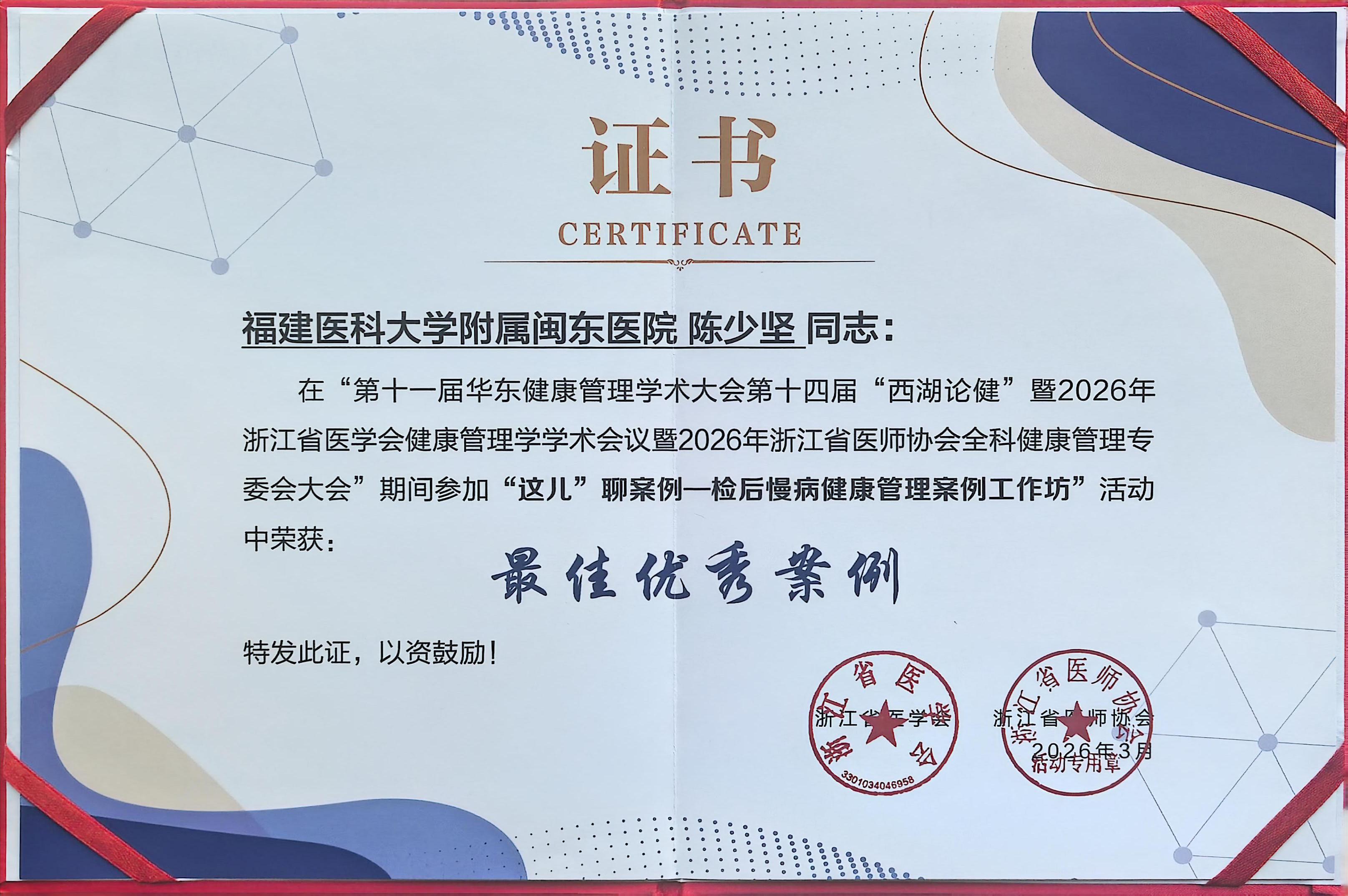 东南网3月22日讯(通讯员 童华蓉)3月12日至3月15日,在浙江杭州召开的第十一届华东健康管理学术大会暨第十四届“西湖论健”上,宁德市闽东医院健康管理科陈少坚副主任医师凭借其在检后慢病健康管理领域的创新实践,荣获大会“最佳优秀案例奖”,其专业能力获得与会专家及同行的高度评价。