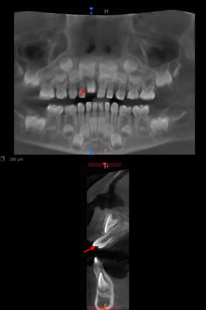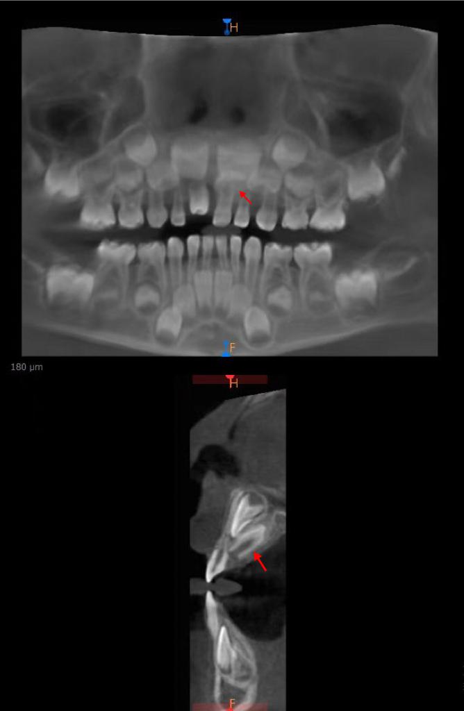 更为惊人的是,CT影像还揭示了另一个隐藏的“秘密”——在患儿左侧门牙牙根舌侧,竟还倒置生长着另一颗埋伏的多生牙。这颗牙齿犹如一颗“定时炸弹”,向上生长,极可能影响未来恒牙的正常萌出。