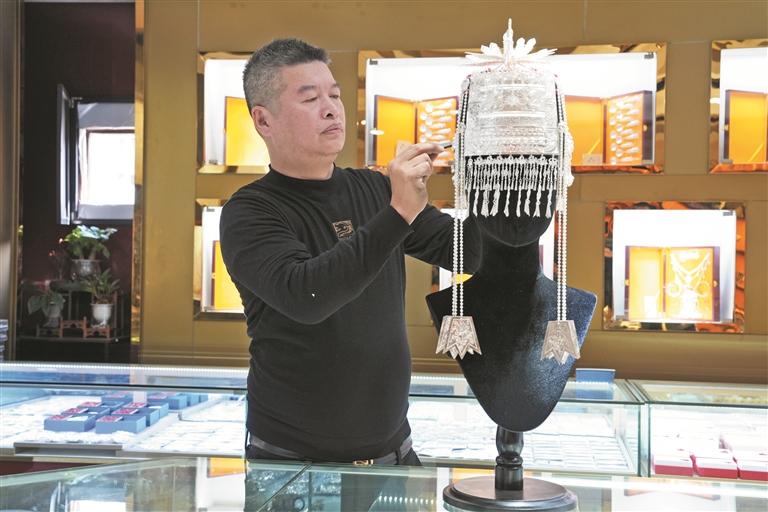 杨仙福梳理新打造的凤凰冠 右手执锤,左手握錾,一敲一挪间,錾刀在银板上自如游走,留下一道道细密而精准的凹痕。不一会儿,一朵生动饱满的花便跃然板上,栩栩如生。 “打好一件银器,图案是关键,只有做到心中有画,才能手下有准,不偏不倚。”谈起手艺,钟伏松目光炯炯。 畲族是一个有语言而无文字的民族,银器,便成了畲族人记录历史、装饰生活的重要载体。爱银饰、以银为美,深植于畲族的文化传统。漫长岁月里,匠人通过无数次实践,凝练出“操、凿、起、解、披”五大核心技艺,衍生出30余道复杂工序,不仅塑造了畲族银器独特的艺术面貌,更铸就了深厚的银器文化。 “来去三千客,四万打银人。”一句古语,勾勒出闽东畲银昔日的繁荣盛景。旺盛的需求,孕育了众多技艺精湛的匠人。“畲族人在出生、婚嫁等人生重要时刻都离不开银器。特别是女儿出嫁,但凡家境好些的,总要请银匠打上一套嫁妆。”旧时,钟伏松时常挑着工具箱,跋山涉水,赴罗源、霞浦等地打银,“打银费时,需要住在对方家中,有时一住就是个把月”。 后来,随着现代化机械的普及,手工制银的效率落了下风。可仍有不少一心守艺的老匠人,坚守着这份传承。 在福安繁华的闹市,“林仕元大师工作室”内,畲族银器制作技艺国家级非遗代表性传承人林仕元正伏案工作。在打磨机的细微声响中,银器表面逐渐绽放出细腻的光泽。“生活水平提高了,人们对银器的美观和多样性有了更高要求。我们必须不断融入新元素,才能走得更远。”林仕元坦言。