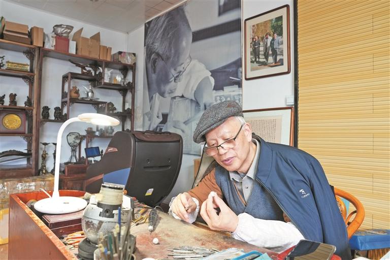 林仕元仔细检查打磨完的作品 这些年,林仕元在深耕传统技艺的基础上大胆创新表现形式。 他的工作室外的展厅,宛如一部畲银发展简史:从质朴无华的首饰茶具,到精巧绝伦的各类摆件,技艺流变的脉络清晰。 其中,一件题为《金陵十二钗》的银摆件尤为引人注目,人物衣袂线条流畅,神韵盎然,仿佛将中国画的气韵注入银器中。“这个人物系列,花了3年多才完成。”林仕元说,在这件作品上,他汲取木雕、牙雕等其他艺术的精华,努力拓展银器的表现边界。由他带领团队创作的银雕大作《清明上河图》更历时6年多创制,已收藏于福建博物院。 当下,林仕元将更多心血投入人才培养,因为他笃信“非遗传承,关键在人”。不久前,一份制作4顶畲族凤凰冠的订单到来,他特意邀请省级工艺美术大师杨仙福合作创作。“这些活儿我一个人也能做,但传承需要一群人接力。” “作品要过林大师的‘法眼’,可不敢有半点马虎。”杨仙福在传统形制中融入精细编织、多重錾刻与巧妙镶嵌等技法,对凤凰的体态、羽翼、冠饰反复推敲。3个月后,当那两顶灵动立体、华光熠熠的凤凰冠呈于林仕元面前,他端详良久,欣然颔首。 锤声錾韵,穿越时光,诉说坚守;银光璀璨,融汇古今,绽放新花。从钟伏松到林仕元,再到杨仙福,一代代匠人手掌的温度与心中的热爱,让这项古老技艺在新时代生生不息。(闽东日报 陈雅芳 文/图) |