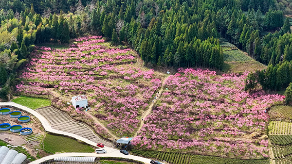走进桃园,仿佛置身于一片粉色的海洋。放眼望去,连绵的山坡上,一株株桃树亭亭玉立。枝头上,一朵朵、一簇簇粉红色的桃花挂满枝头,有的含苞待放,娇艳欲滴;有的迎风怒放,摇曳生姿。微风拂过,花香四溢,沁人心脾,蜜蜂在花间穿梭忙碌,勾勒出一幅生机勃勃的春日画卷。