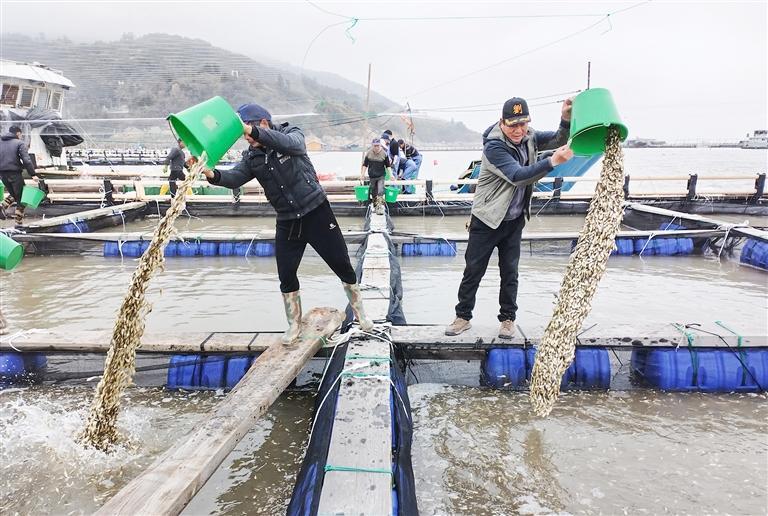 养殖户将鱼苗撒向网箱 每年春分前后,天气回暖,大黄鱼育苗便迎来“搬家”入海的好时机。连日来,在福鼎市沙埕镇中心渔港海域,当地各大水产养殖户积极开展大黄鱼春苗投放工作。 清晨时分,福鼎市盛源水产专业合作社的渔排上呈现出一派热闹景象。活水船上的渔民合力拉起渔网,将大黄鱼春苗聚拢,工人们手持水桶迅速舀起鱼苗,接力传递,将鱼苗撒向网箱,一尾尾活蹦乱跳的春苗跃入“新家”。 “这批春苗是去年12月开始培育的,现在长到6.5厘米至7厘米,达到下排条件。”合作社负责人郑顺利告诉笔者,为提升育苗品质,去年合作社投入200多万元更新水体供氧及杀菌设备,经过科学化培育,鱼苗长势喜人,比往年提前10天达到下排条件。 郑顺利深耕大黄鱼育苗及养殖多年,有着丰富的实践经验,他说:“现在海区水温15℃左右,这时候投苗,可以让鱼苗提前适应海区环境。不过鱼苗下排后,还需关注其生长情况,重点做好病虫害防治,加强科学投喂管理,增强鱼苗免疫力,确保鱼苗健康成长。” 据了解,该合作社今年预计投放大黄鱼春苗6000万尾,这批鱼苗将在渔排上暂养约10天,待长到出售标准后,即可运往销售。目前,合作社的大黄鱼春苗已被闽浙两地养殖户预订完,预计产值达1500万元。 沙埕镇是闽东地区最大的大黄鱼鱼苗交易场,当地海域水质通透性强,天然饵料丰富,为大黄鱼育苗及养殖提供得天独厚的条件。近年来,当地持续推动渔业设施升级改造,推广深海抗风浪网箱养殖,推动养殖模式向高效化、生态型现代渔业转型升级,不断提升大黄鱼品质和产业竞争力。据统计,目前,当地有大黄鱼育苗室16家、养殖户189户,大黄鱼深远海大网箱养殖601口、小网箱1316口,已形成从苗种繁育、成鱼养殖到加工销售的全产业链条,为推动当地渔业高质量发展注入强劲动力。 作为全国重要的大黄鱼苗种基地,今年福鼎市大黄鱼春苗预计总产量达13亿尾,产值近2.8亿元。福鼎市海洋与渔业局相关负责人表示,下一步,将加强苗种质量监管和技术指导服务,确保春苗下排后健康生长,为全年大黄鱼稳产增收保驾护航。(闽东日报 夏岩缘 杨东 文/图) |