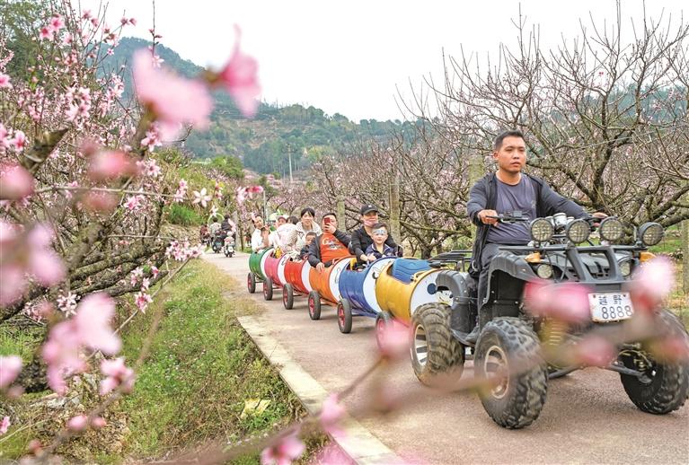 游客在桃园里游玩赏花 春分至,万物兴。近日,福安市穆云畲族乡万亩桃林迎来盛花期,粉白花瓣随风摇曳,宛如粉色绸缎铺展在青山绿水间,勾勒出一幅诗意盎然的畲乡春日画卷。 游客穿梭于桃林间,赏花踏青、拍照留念,沉浸式感受春日浪漫。桃林旁,畲家特色小吃摊香气四溢,糍粑、乌米饭等美食备受青睐,桃花酒、桃胶等也成为游客选购的热门产品,农家乐订单节节攀升,热闹非凡。 近年来,穆云畲族乡以花为媒、以旅兴农,依托桃花景观与畲族文化特色,持续深耕农文旅融合发展,将生态优势转化为增收动力,让春日美景真正变成了富民“钱景”。(闽东日报 吴景华 文/图) |