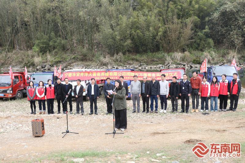 活动现场。东南网记者 周涛 摄 此次活动由蕉城区海洋与渔业局、蕉城区八都镇人民政府、蕉城区赤溪镇人民政府、蕉城区慈善总会、宁德市官井洋大黄鱼养殖有限公司联合举办,其中,宁德市官井洋大黄鱼养殖有限公司主动捐赠134.4万尾香鱼苗,以实际行动践行企业社会责任,助力霍童溪生态保护。