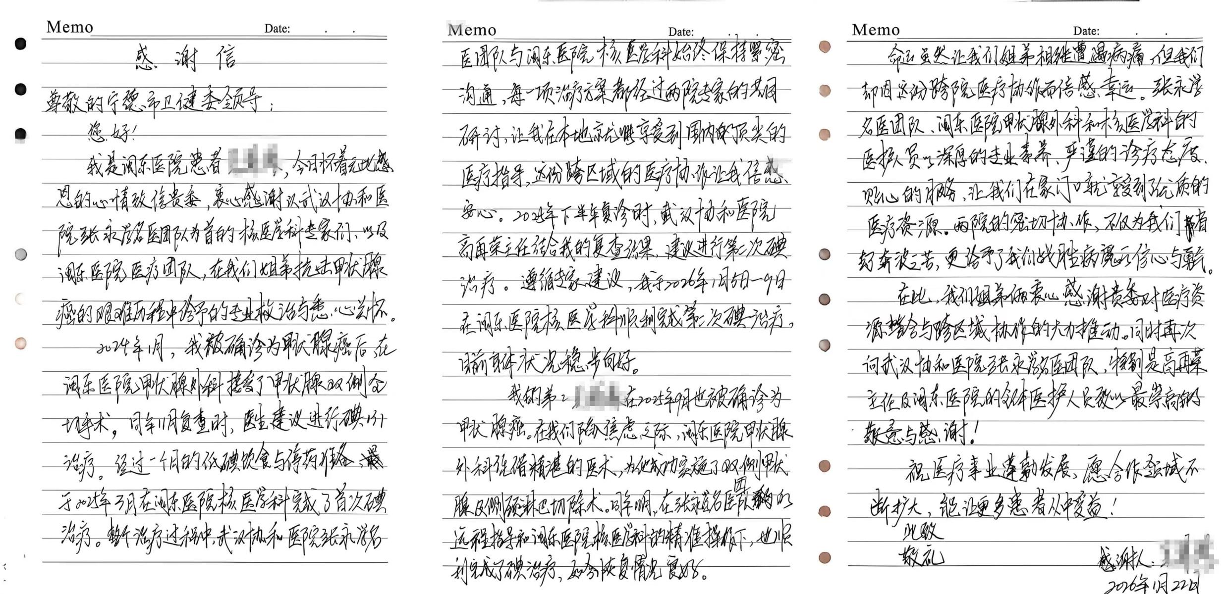 东南网4月3日讯(通讯员 邓乐琦)近日,宁德闽东医院核医学科收到一封情真意切的感谢信。信中,甲状腺癌患者吴女士深情讲述了自身与弟弟在武汉协和医院张永学名医团队与宁德市闽东医院医疗团队的共同护航下,姐弟二人相继战胜病魔的温暖历程。这封信不仅是对医护精湛医术与仁心服务的肯定,更是宁德市闽东医院与国内顶尖医院深化跨区域医疗协作、推动优质资源下沉的生动写照。