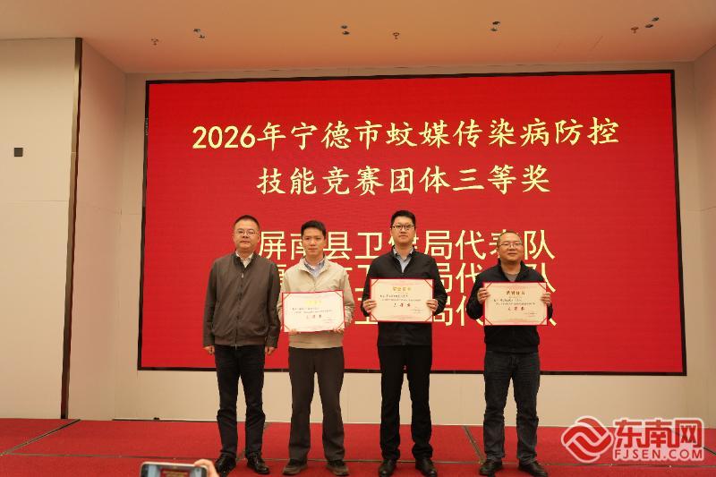 团体赛三等奖颁奖。东南网记者 潘月容 摄 此次竞赛既是岗位练兵的“大比武”,也是防控能力的“大检阅”。下一步,宁德市将以此次竞赛为契机,持续加强蚊媒防控队伍建设,强化监测预警、应急处置与群防群控,切实筑牢春夏季蚊媒传染病防控屏障,守护人民群众身体健康。 |