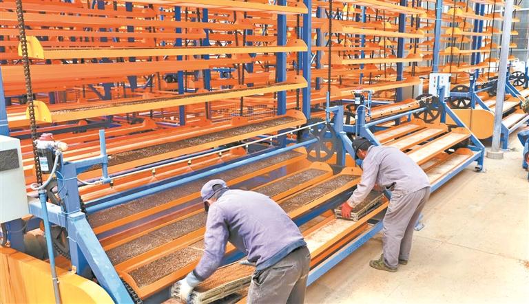 工人将发芽的种子移入苗盘培育 春日农忙正当时。在福鼎市太姥山镇的福鼎农垦智慧育秧中心内,水稻精密育秧播种流水线高速运转,机械轰鸣声奏响了春耕备耕序曲。 铺土、喷淋、播种、覆土、叠盘,一系列育秧工序有序运转,数名工人适时补充有机土与水稻种子,保障各环节衔接顺畅。 传统育秧场景如今被工厂化的流水线作业所取代。依托智慧育秧中心的技术支撑,福鼎市春耕备耕工作高效推进,为该市8300亩早稻生产筑牢根基。 在福鼎农垦智慧育秧中心,隐藏着多项农业“黑科技”。据现场技术人员介绍,该中心投入使用的播种流水线,搭载气吸振动整盘式播种系统,具备很高的作业精度与效率,每穴播种量稳定控制在2粒至4粒,每小时可完成秧苗播种2000盘,相较传统人工育秧,作业效率大大提升,彻底改变传统育秧耗时费力的局面。 智慧育秧到底好不好,种粮大户最有发言权。“以前我们在田里育秧,10个人只能育100亩,现在4个人就能育100亩,大大减轻了劳动力成本。”店下镇种粮大户陈光摇说,传统田间育秧“靠天吃饭”,气温忽高忽低,盖膜后极易烂苗,成活率只有70%左右,而智慧育秧中心犹如给秧苗建了一个“恒温箱”,管理精细,成活率接近100%。 完成精准播种与覆土的秧盘,被送入智能育秧密室开展集中催芽,工人为秧盘盖上遮光布,通过暗化处理,为种子营造恒温恒湿的生长环境,经过约48小时的暗化催芽,种子便破土露白,随后秧盘被移入苗床继续培育。 智能育秧室的智能化调控系统,是秧苗茁壮成长的关键。福鼎农垦智慧育秧中心太姥山国有农场片区负责人蓝春建介绍,育秧室配备专业温、湿度调节系统,能精准模拟秧苗生长所需的最佳自然条件,并使用自动化测控用水技术,实现水肥一体化供给。在智能系统的精细化管理下,秧苗仅需20天就能达到机插秧标准,比传统育秧周期缩短近10天,有效抢抓农时。 相较于传统模式,智能工厂化育秧采用立体循环运动式育秧床,通过多层立体架叠放秧盘,空间利用率大幅提高,有效节约土地资源。育秧全程依靠自动化控制系统与智能环境调控技术,实现了省人力、缩周期、出苗整齐健壮、成苗率高的效果。目前,该中心设有温控智能育秧生产线8条,单批次育苗数量达2万盘。 为让更多农户共享农业科技发展红利,智慧育秧中心量身打造个性化服务模式,推出“定制菜单”式育秧服务。“我们提供两种模式:一种是托管模式,农户把种子交给我们代育;另一种是租用模式,农户租用设备自己育。”蓝春建表示,全托或半托式服务可以满足不同种植户的个性化需求,今年春季,该中心预计完成育秧任务约800亩。 科技赋能,不误农时。据统计,福鼎农垦智慧育秧中心自2024年3月投用以来,累计育秧约5.5万盘,服务水田3100余亩。 近年来,福鼎市持续加大现代农业技术推广力度,大力推进工厂化育秧、机械化插秧等技术应用,不断提升粮食生产全程机械化、智能化水平,扎实筑牢“藏粮于地、藏粮于技”的农业发展根基。随着集约化育秧模式不断普及、精准化农业服务持续深化,福鼎市春耕生产全面按下“快进键”,为全年粮食丰产丰收奠定了坚实基础。(闽东日报记者 黄楚妍 通讯员 杜应影 文/图) |