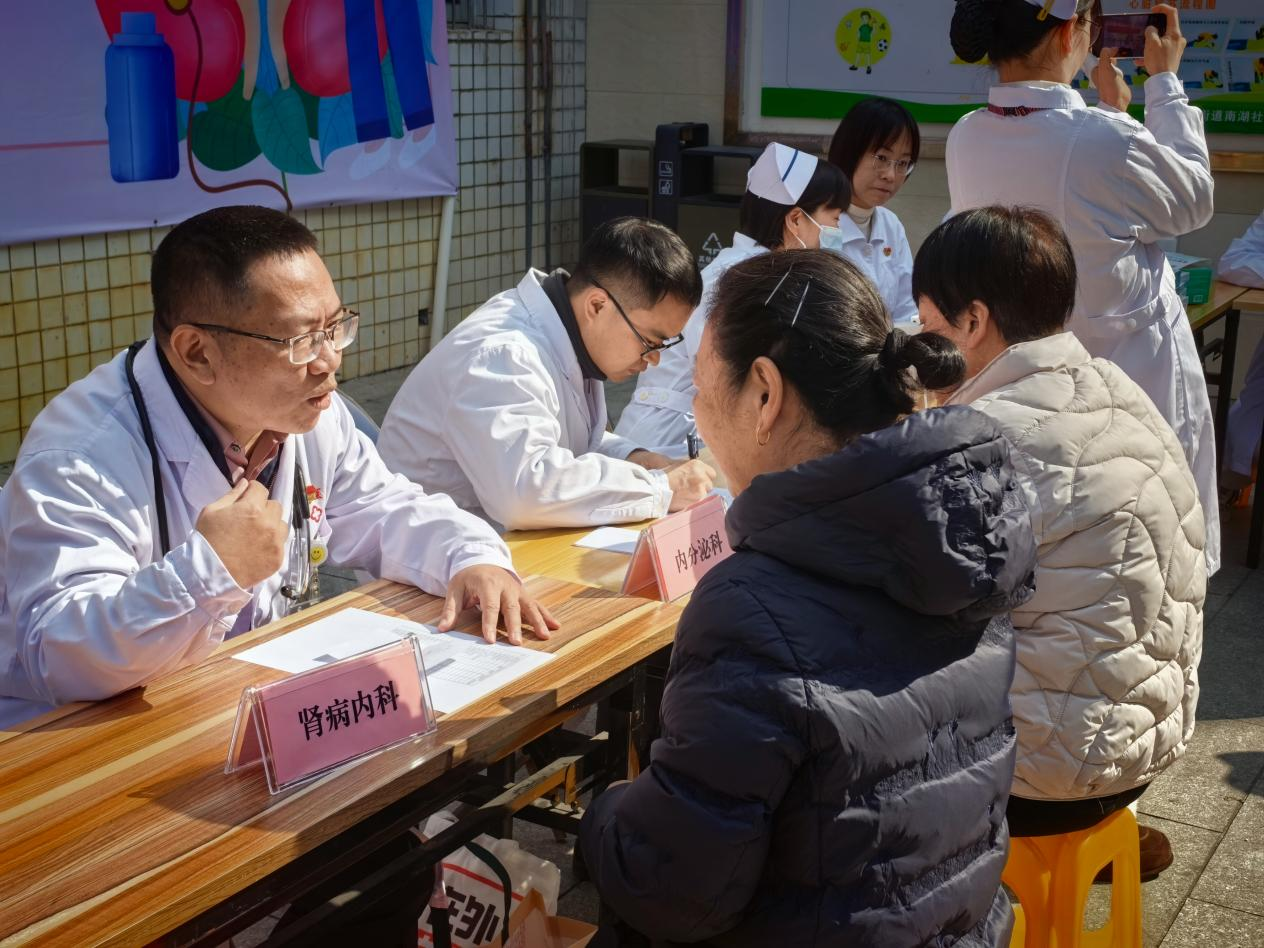 3月12日,来自宁德市闽东医院的委员们联合老年医学科、内分泌科、眼科、临床营养科等多个科室,携手福安市南湖社区,举办了一场多学科联合义诊活动。活动现场人头攒动,前来咨询和检查的居民络绎不绝,大家带着对肾脏健康的疑问,有序等候专家问诊。专家团队一就位便迅速投入工作,各学科分工明确、协同发力:肾病内科专家耐心细致地解答居民关于肾脏保健、疾病预防、病情管控等方面的疑问,拆解“沉默的杀手”——慢性肾脏病的早期信号与防控要点;内分泌科专家聚焦糖尿病、高血压等慢性肾脏病高危因素,为相关人群提供专业用药指导和个性化生活方式建议,强调“控糖护肾”“控压护肾”的重要性;临床营养科专家结合居民个体体质,量身定制科学饮食方案,讲解低盐、低脂、优质蛋白的饮食原则,帮助居民通过饮食调理守护肾脏;眼科专家则借助专业设备,为居民免费检查眼底和视力,排查肾脏相关眼部并发症,实现多系统健康联动守护。现场还专门设置免费体检区,医务人员认真为居民测量血压、血糖,详细记录各项指标,对指标异常者及时给予健康提醒,告知后续检查和干预建议。